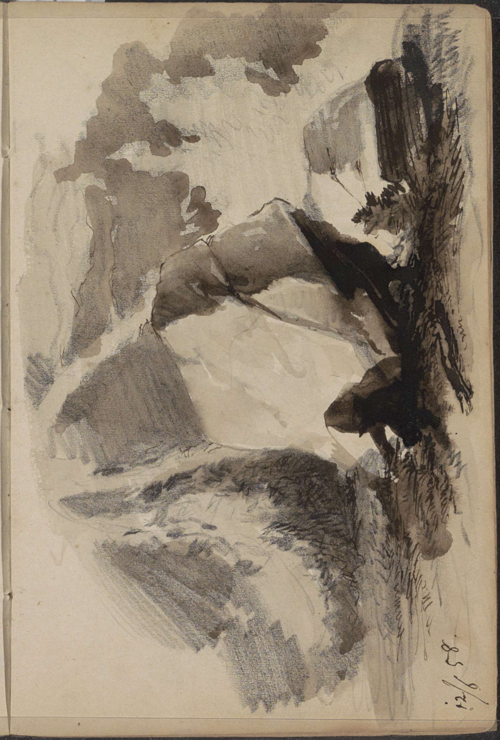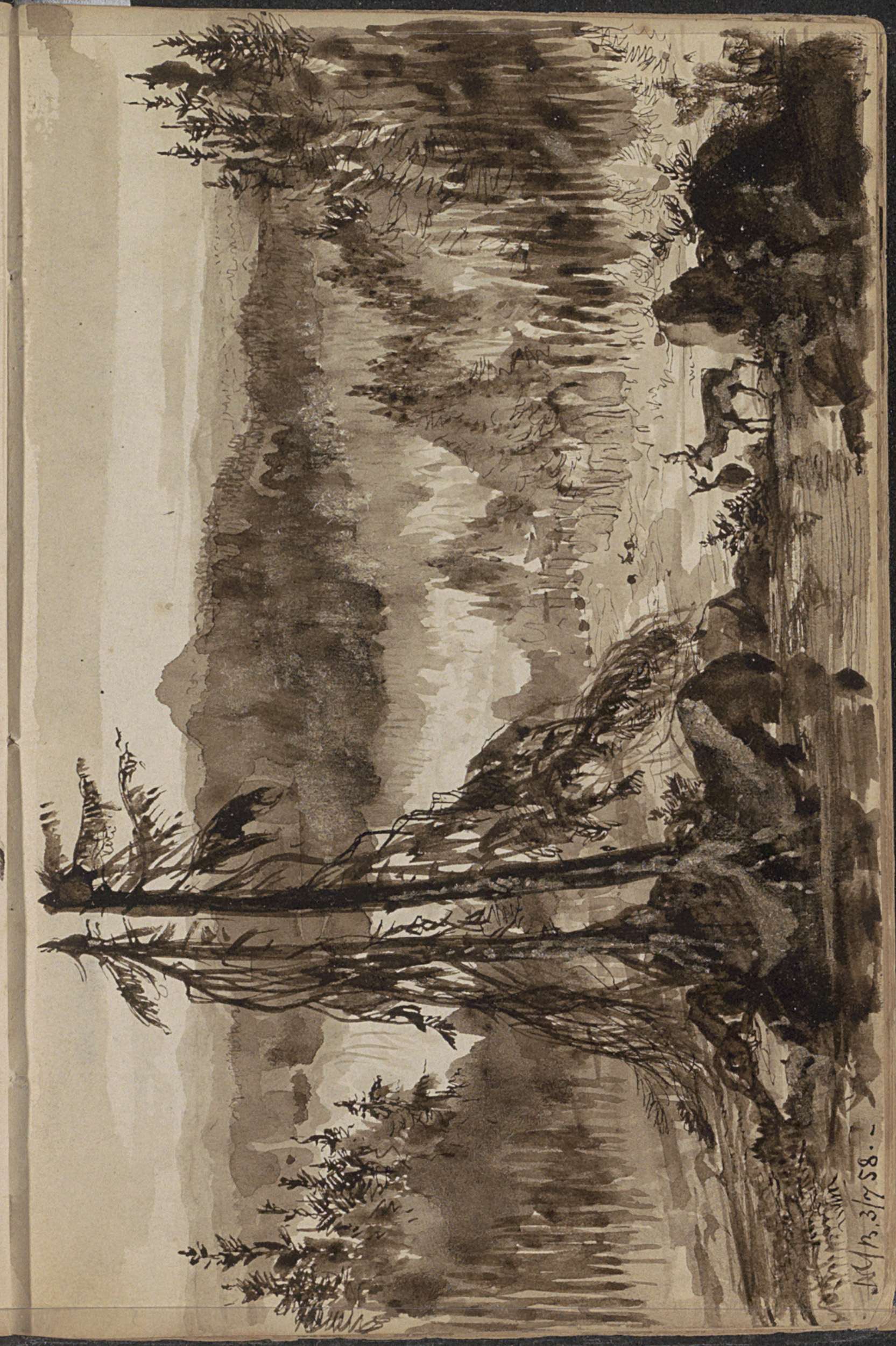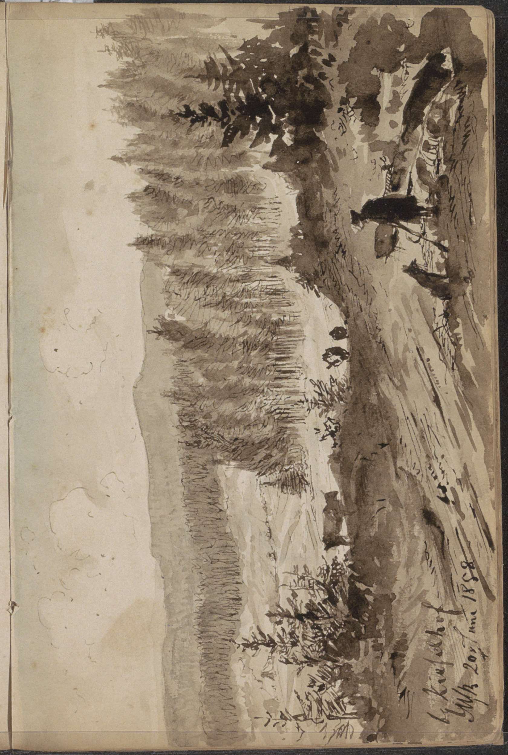 Figuur in een berglandschap met dennenbomen bij Kies...
