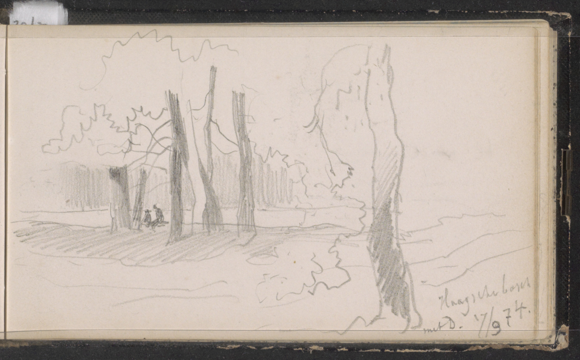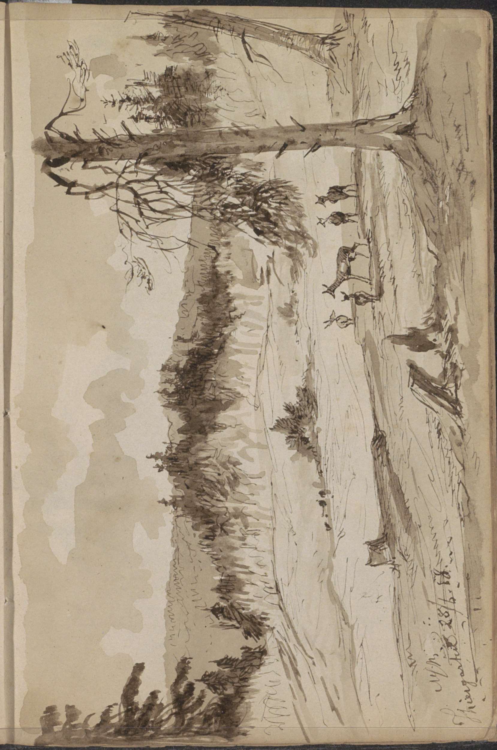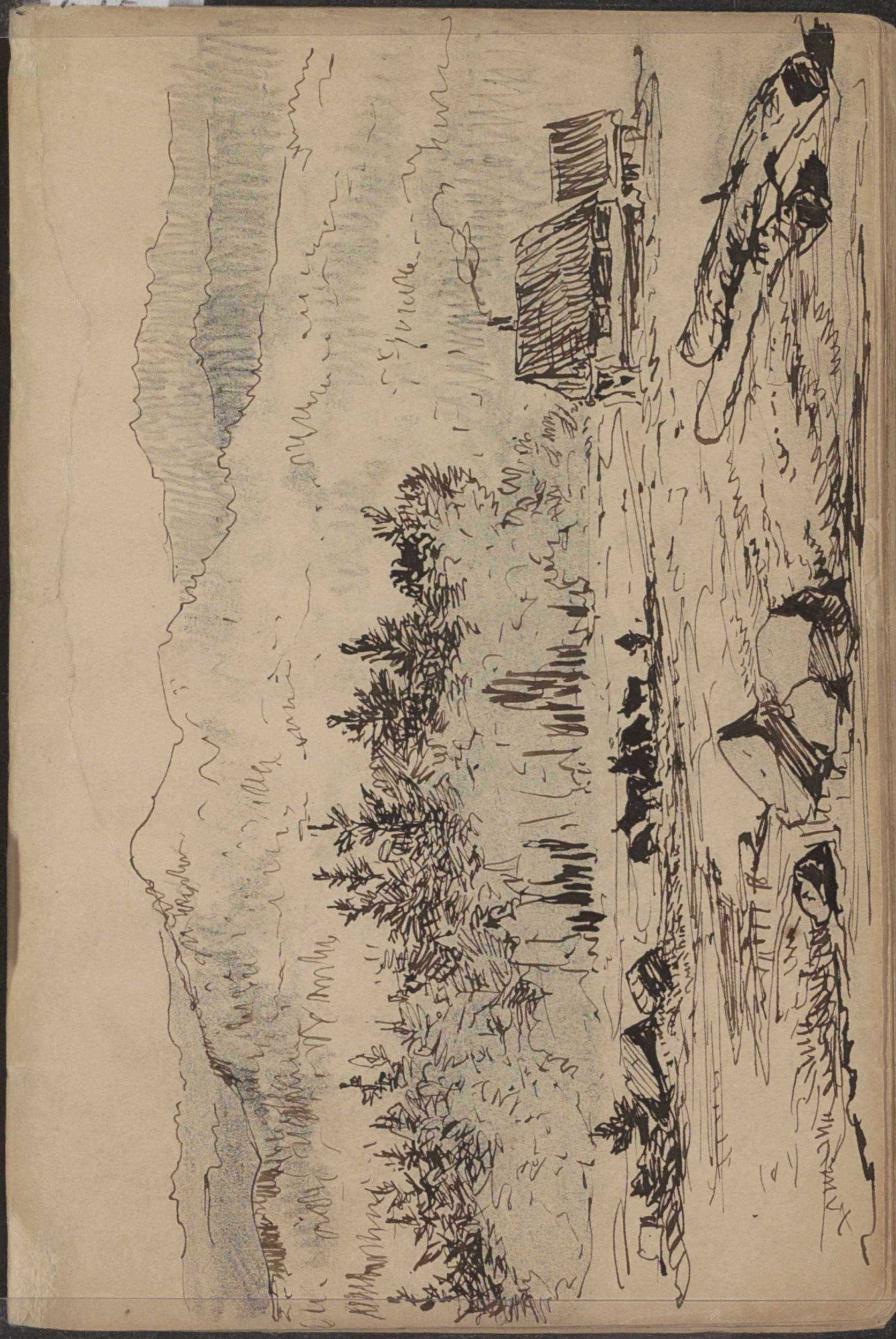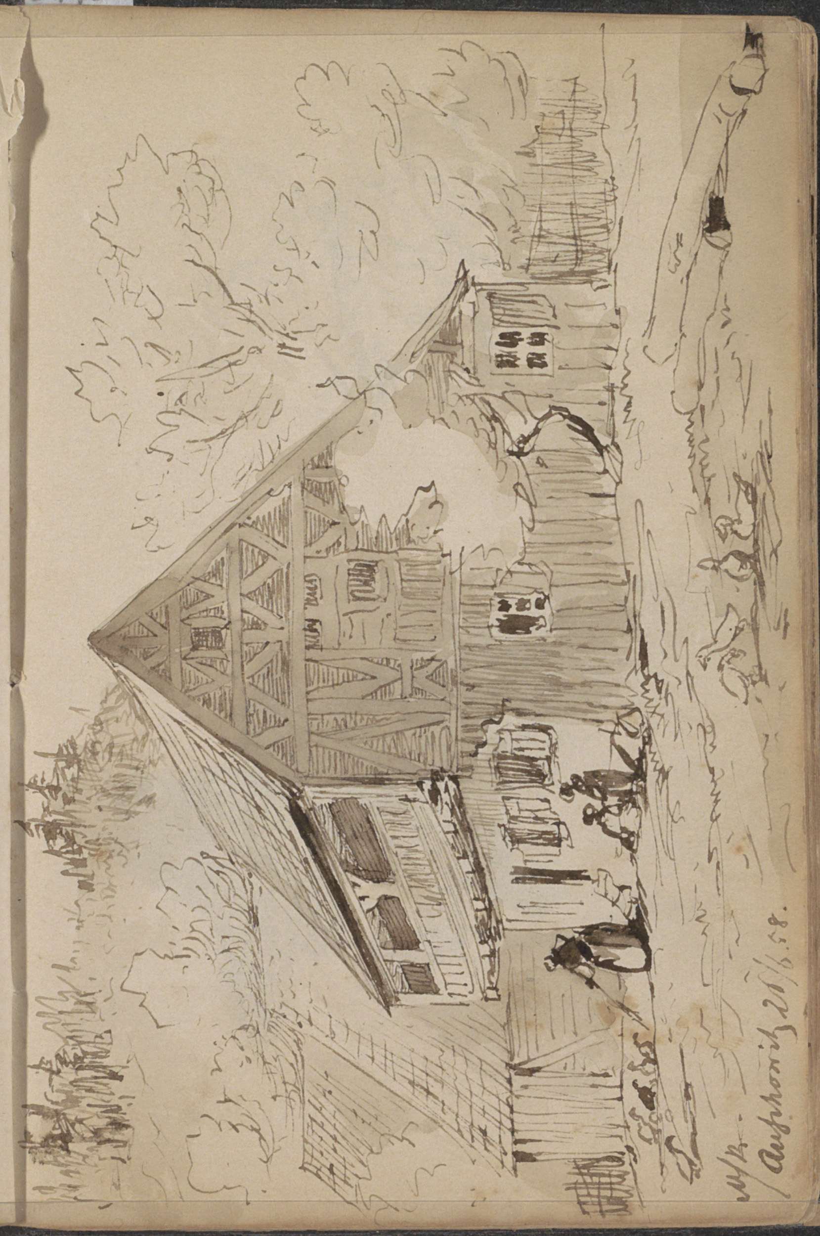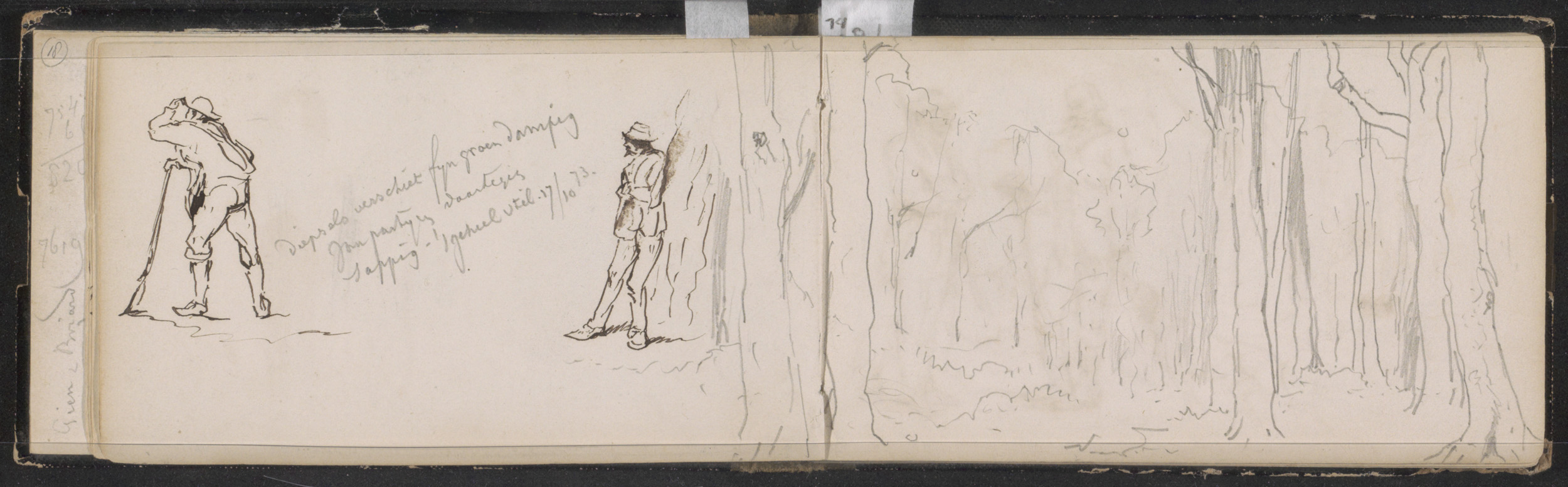 Figuren bij een boerenwoning naast een groep dennenb...