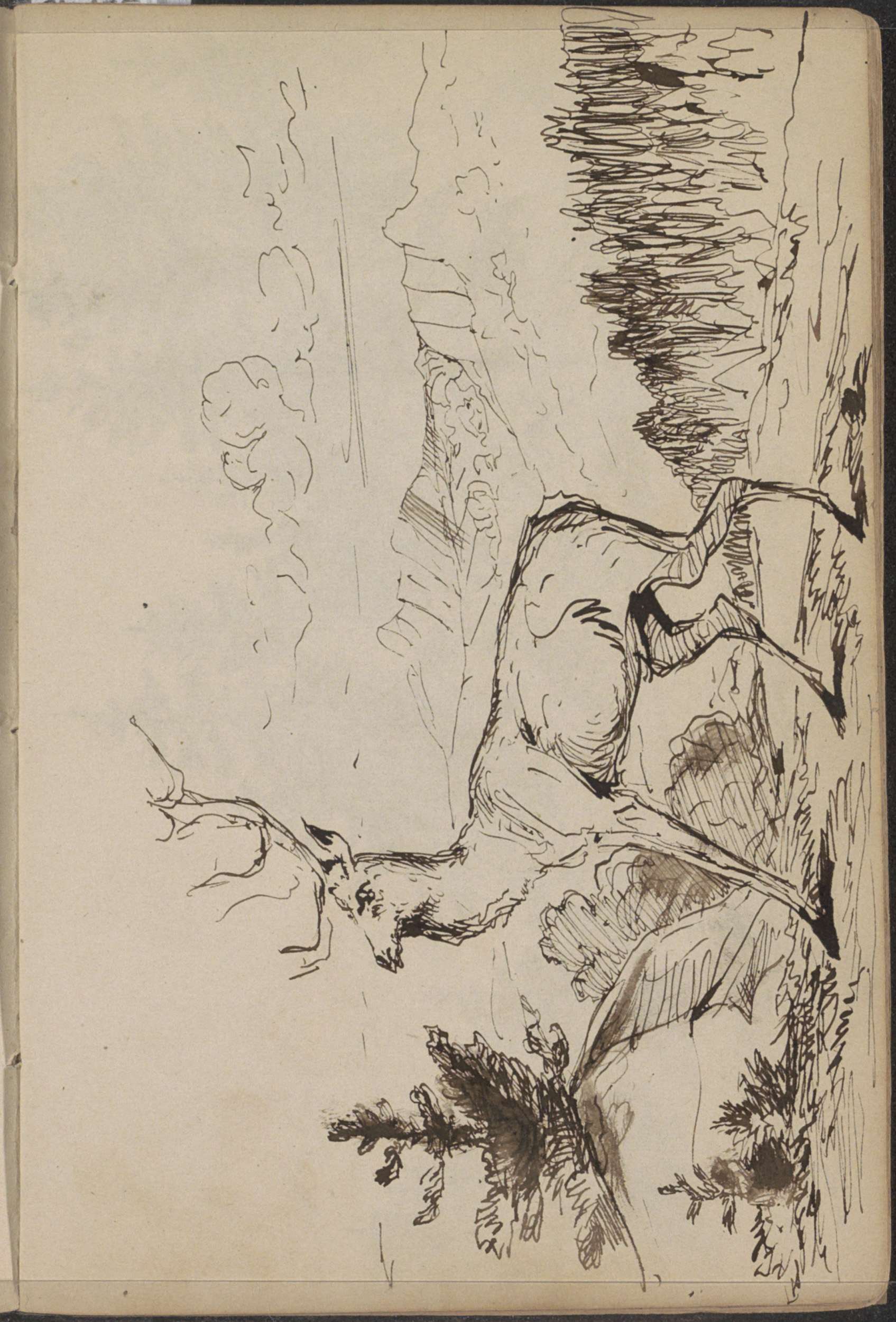 Berglandschap met dennenbomen en een hert