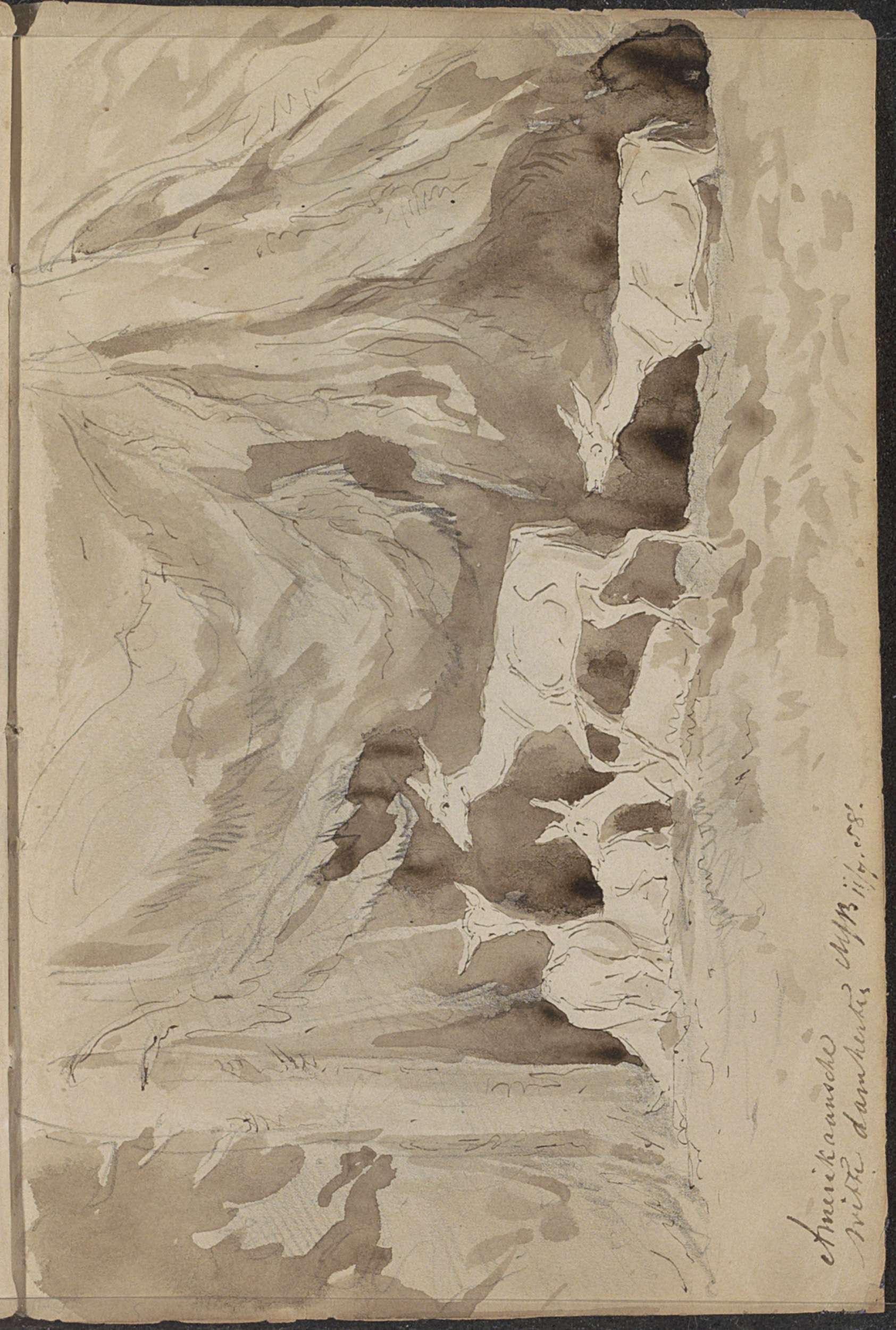 Berglandschap met herten op een brug over een dal