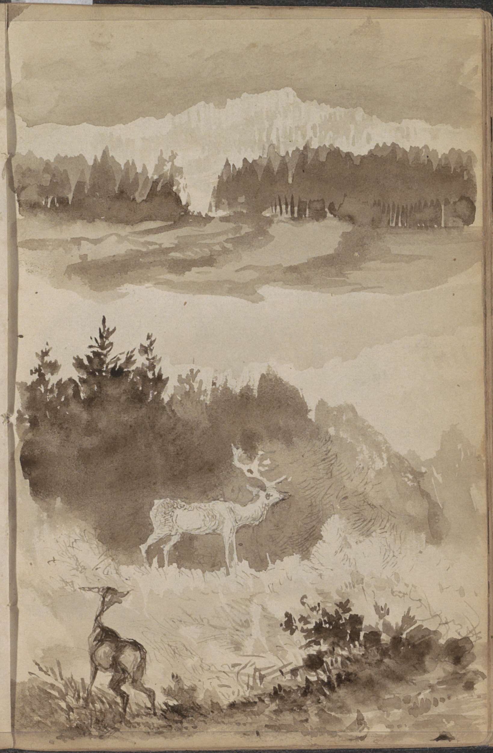 Berglandschap met dennenbomen en herten