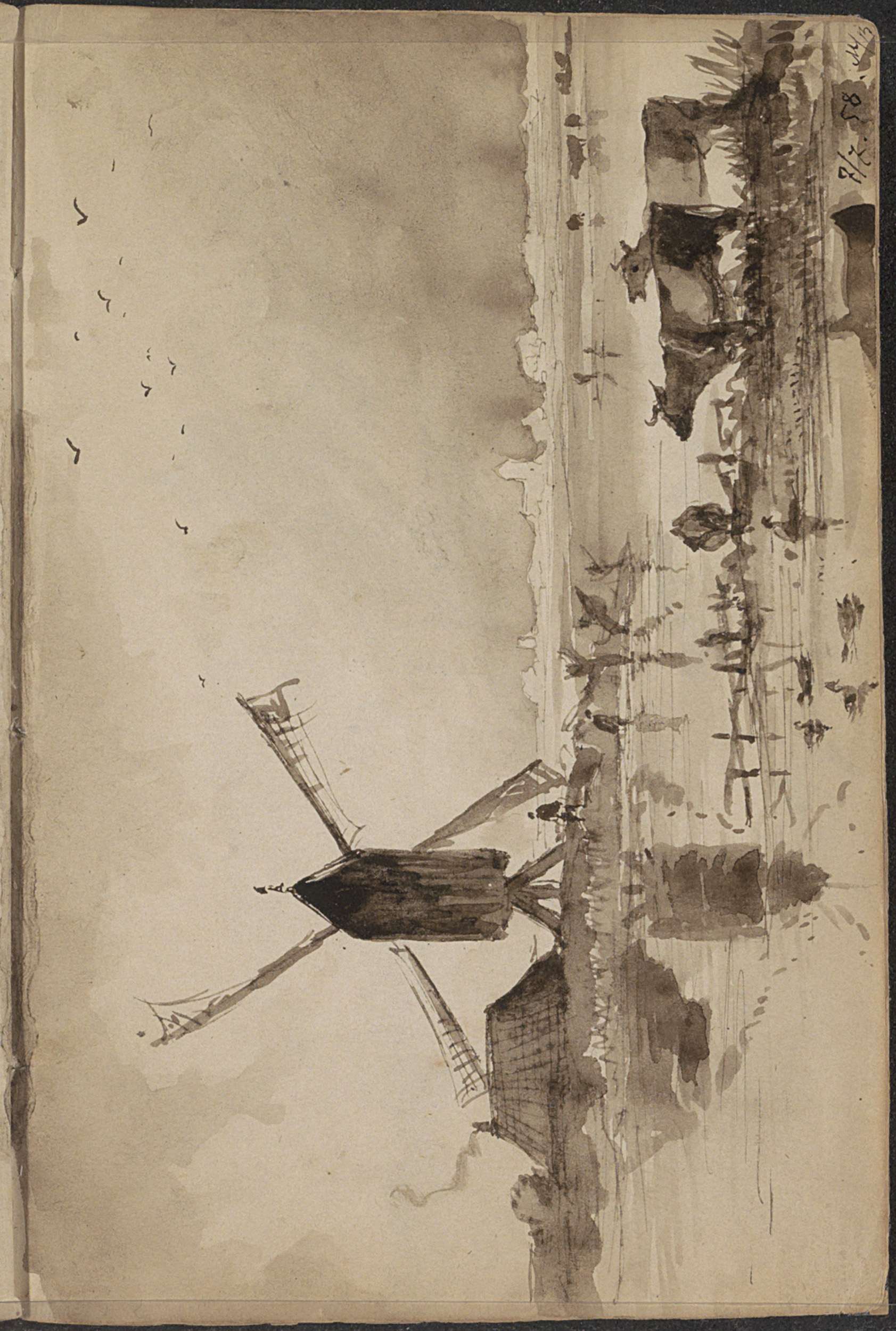 Landschap met weilanden en een molen