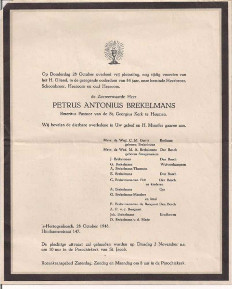 Overlijdenskaart pastoor Brekelmans