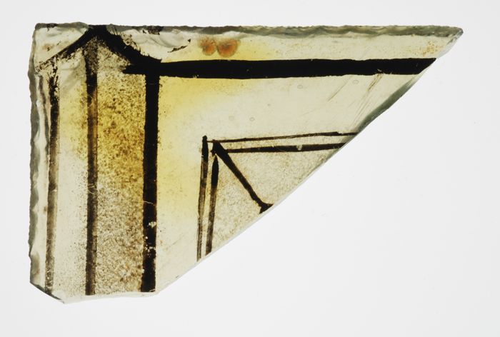 Hoekfragment van groenig vensterglas met gebrandschi...