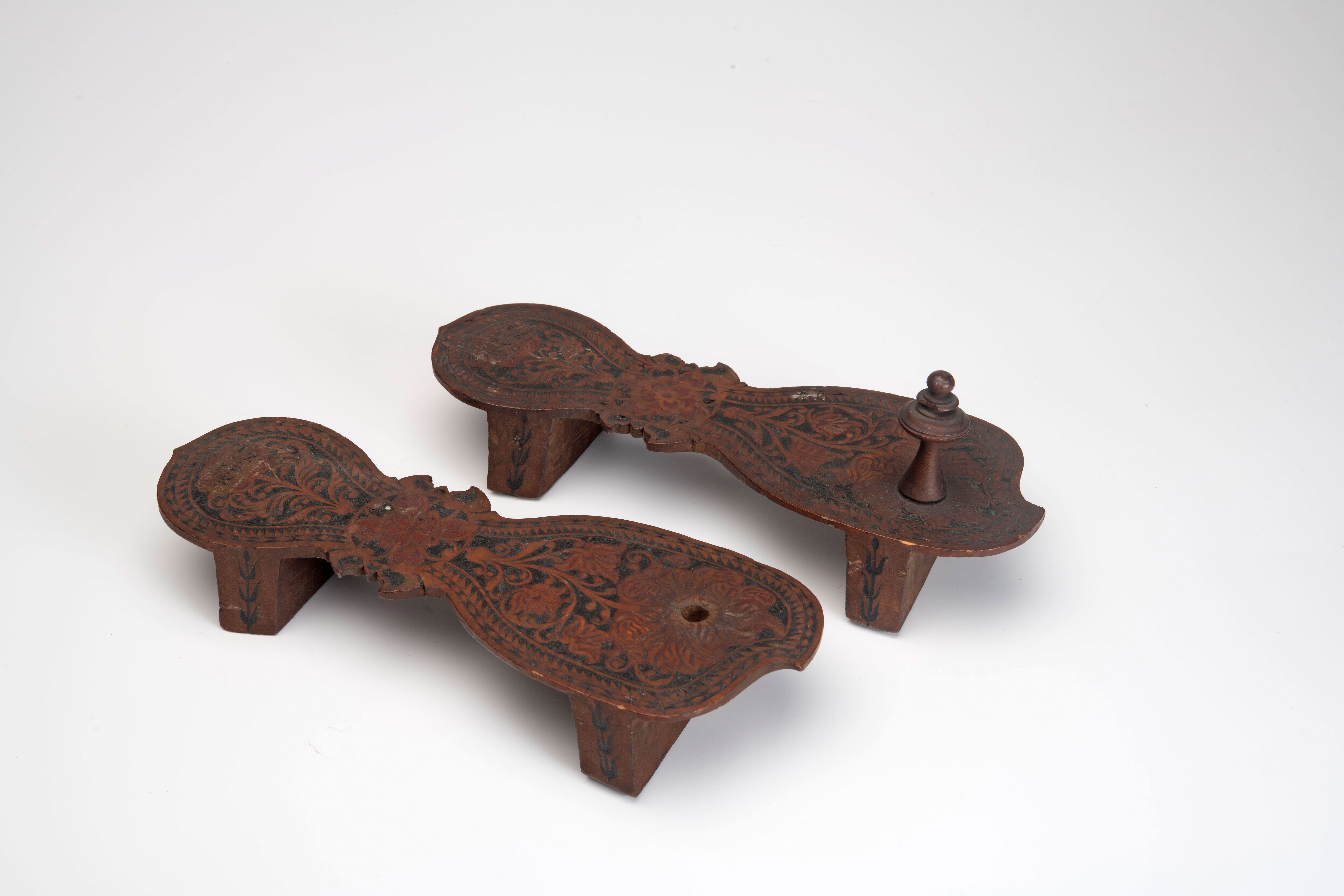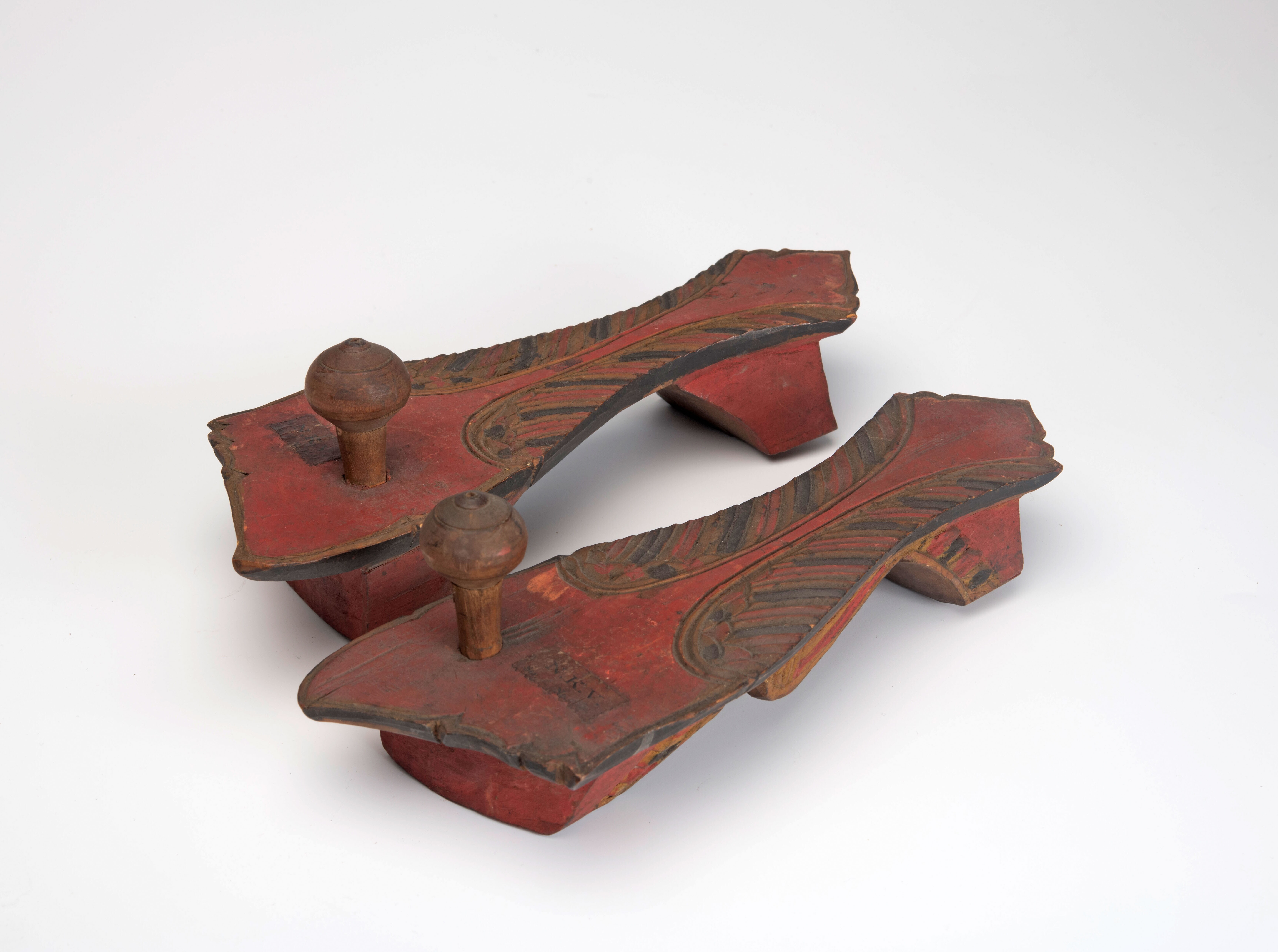 Paar roodgeverfde voetklossen met siersnijwerk