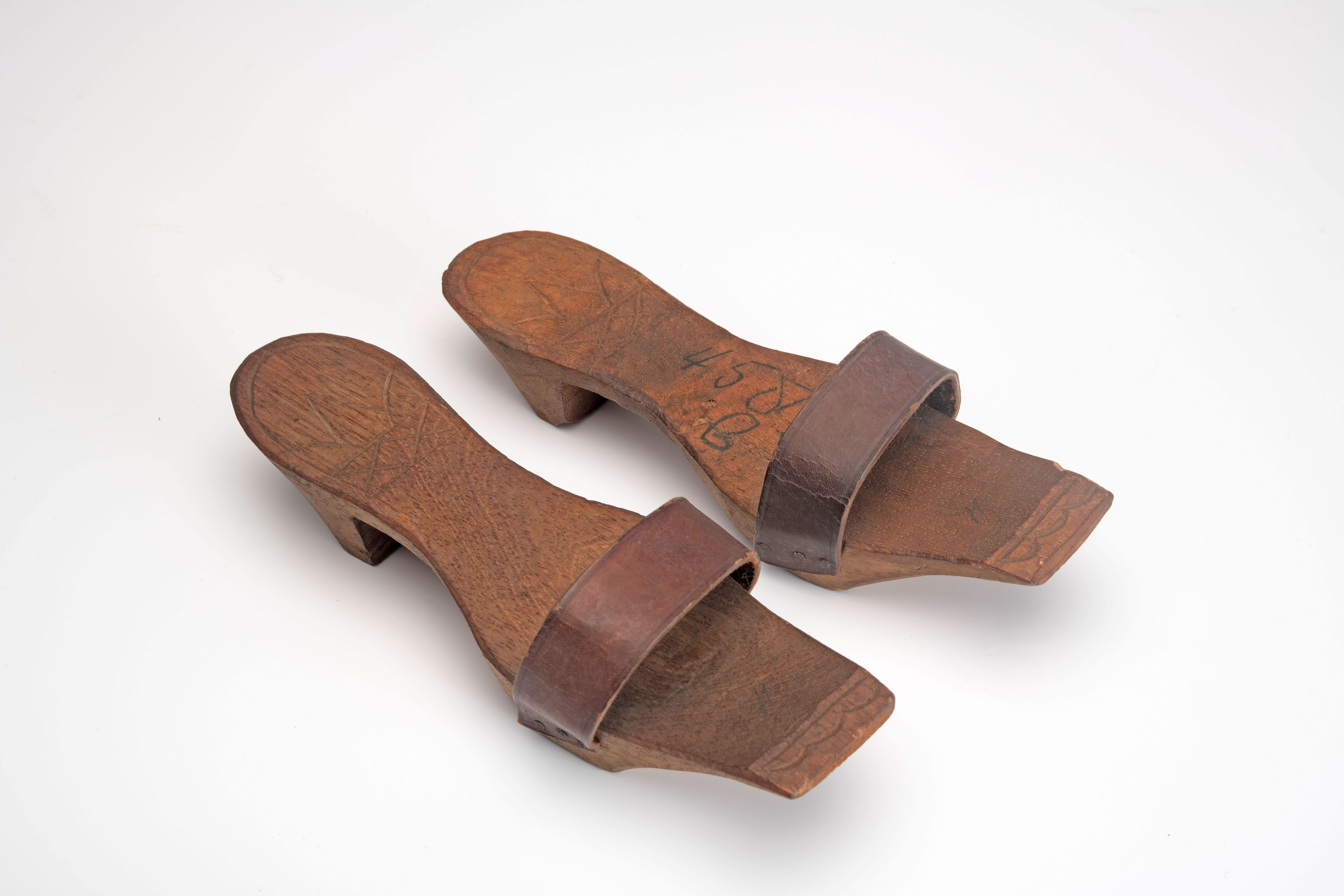 Een paar houten slippers met leren band