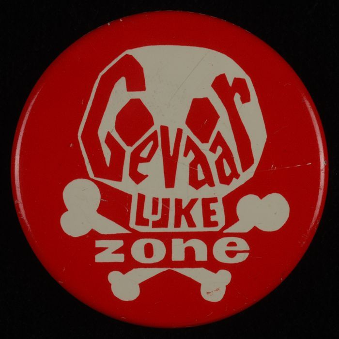 Rode button met witte tekening en opschrift "Gevaarl...