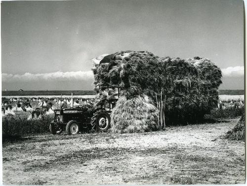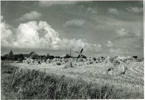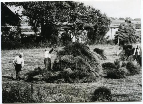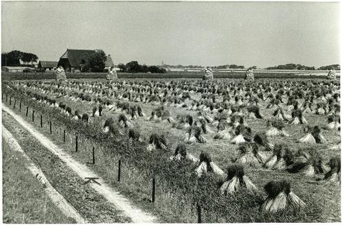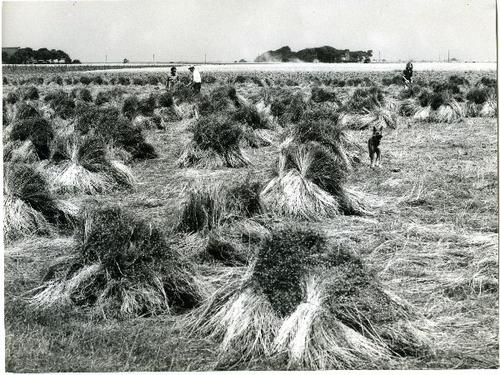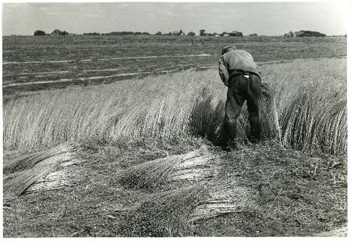 Foto in zwart-wit van vlas op schoven door J.D. de J...