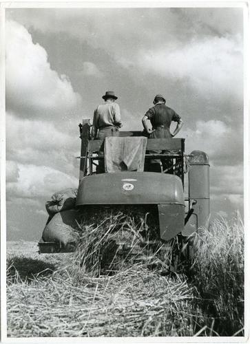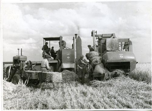 Foto in zwart-wit van een combine en een pakjepers d...