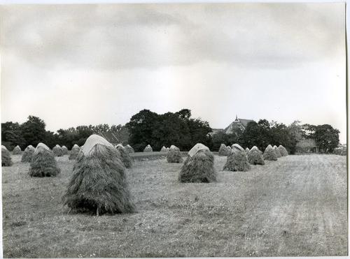 Foto in zwart-wit van schoven graan op hokken door J...
