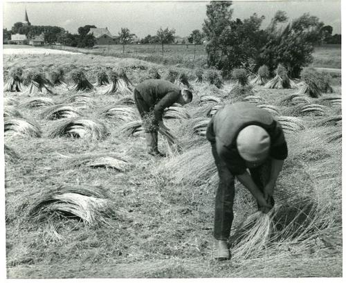 Foto in zwart-wit van het binden van schoven vlas do...