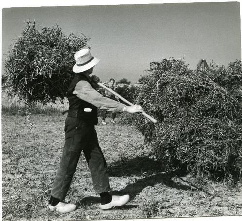 Foto in zwart-wit van het trekken van vlas door J.D....