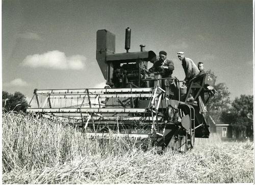 Foto in zwart-wit van maaidorser, een combine aan he...