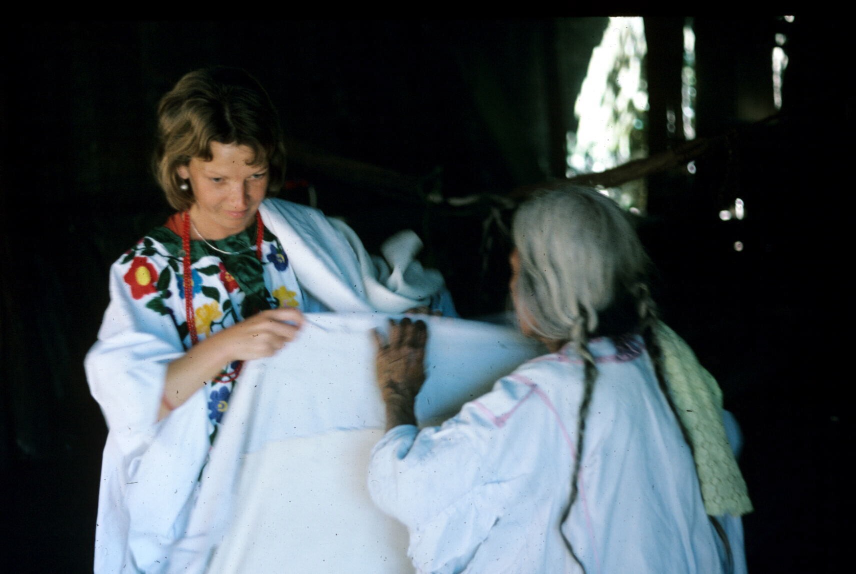 Paula Leyenaar wordt gekleed in dracht van Amatlán