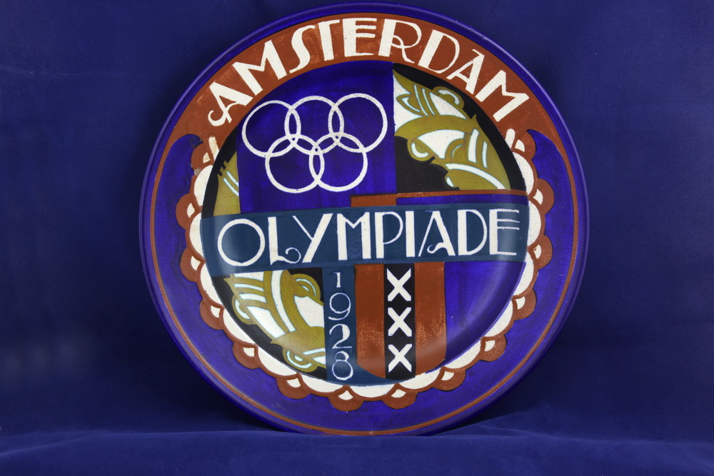 Geel koperen wandbord Olympische Spelen 1928 met str...