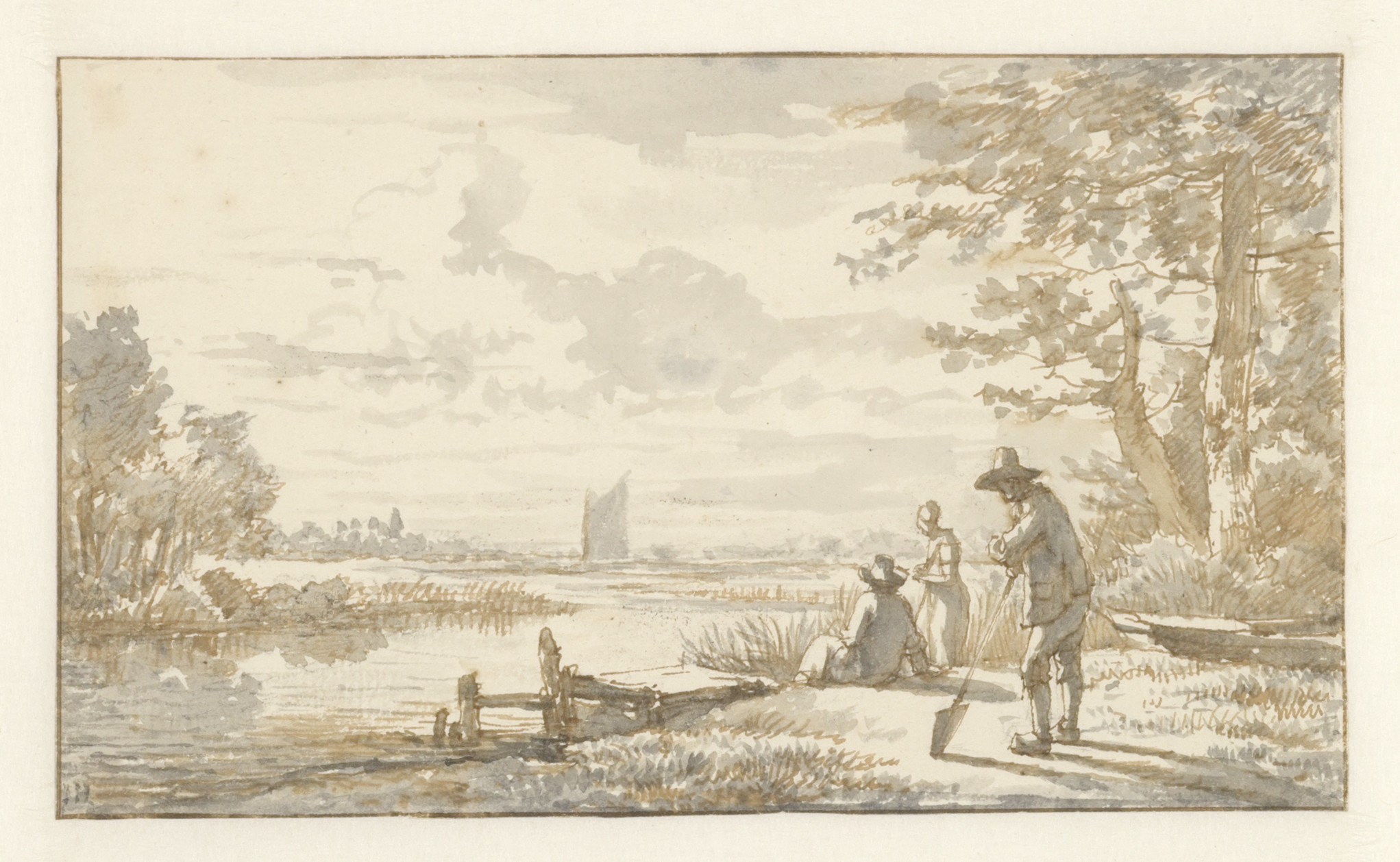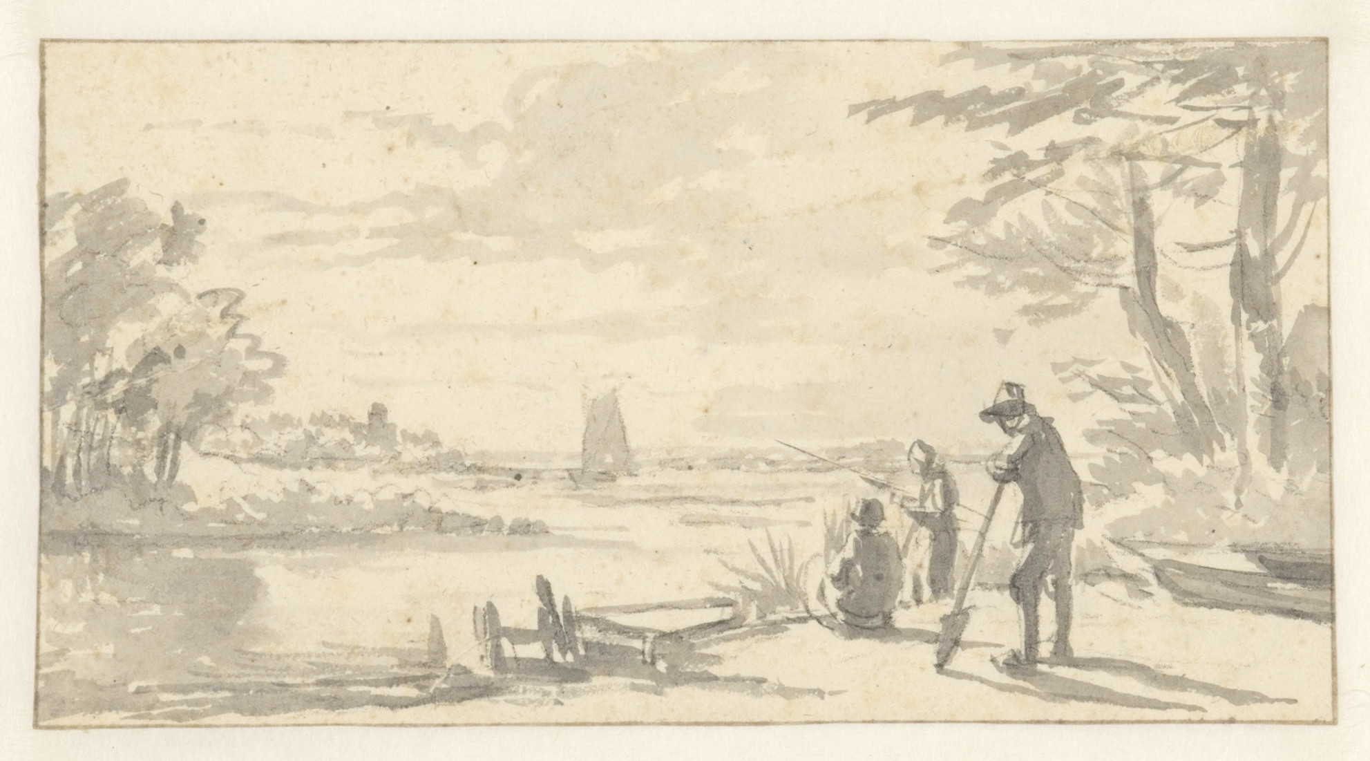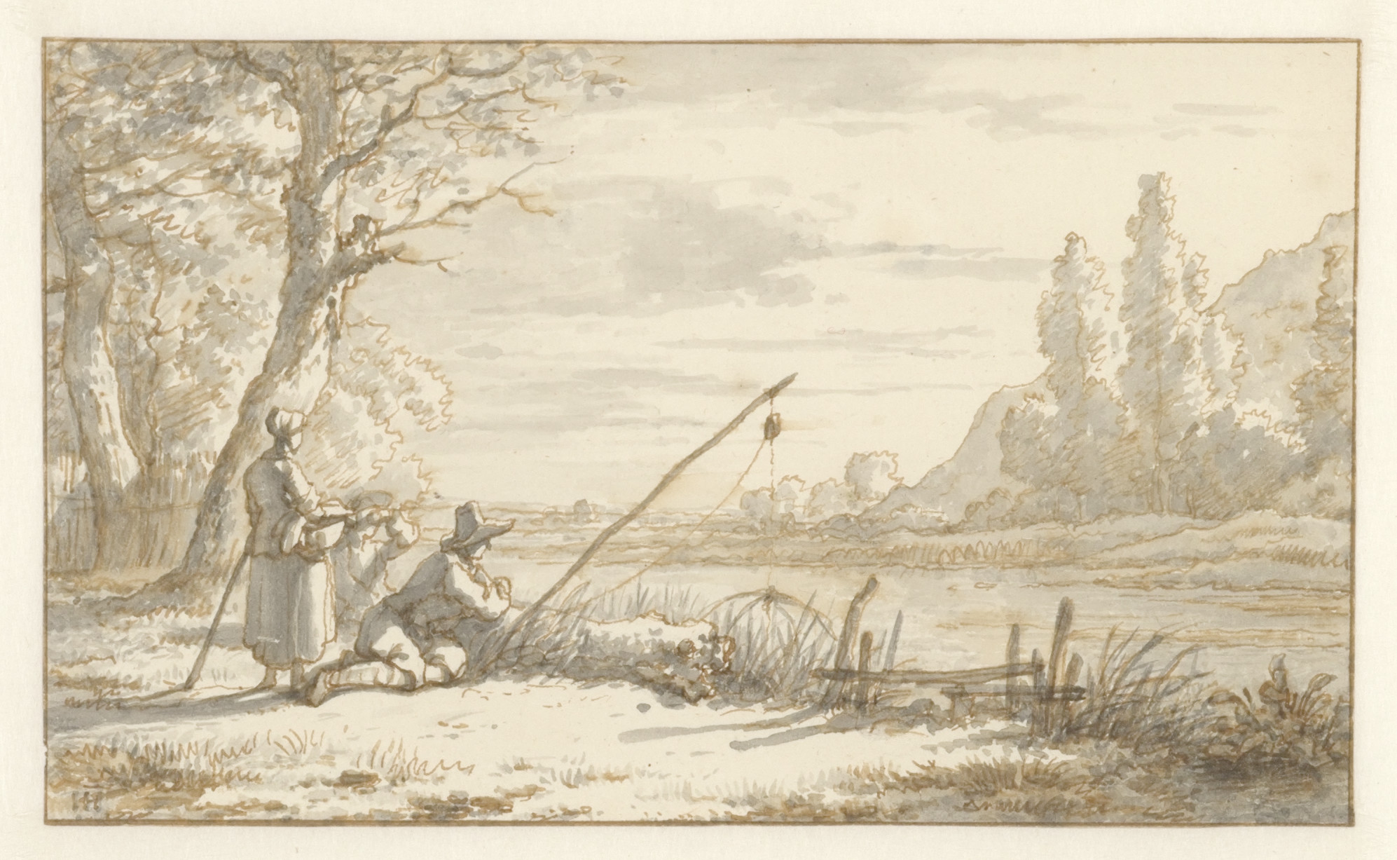 Op den oever van eene rivier vischt een man met een net