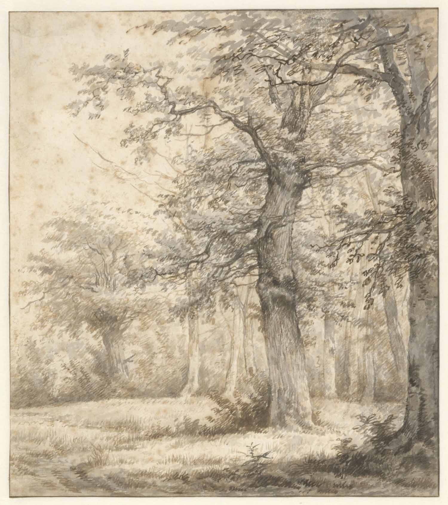 Een landschap met zwaar eikenhout gestoffeerd met ve...