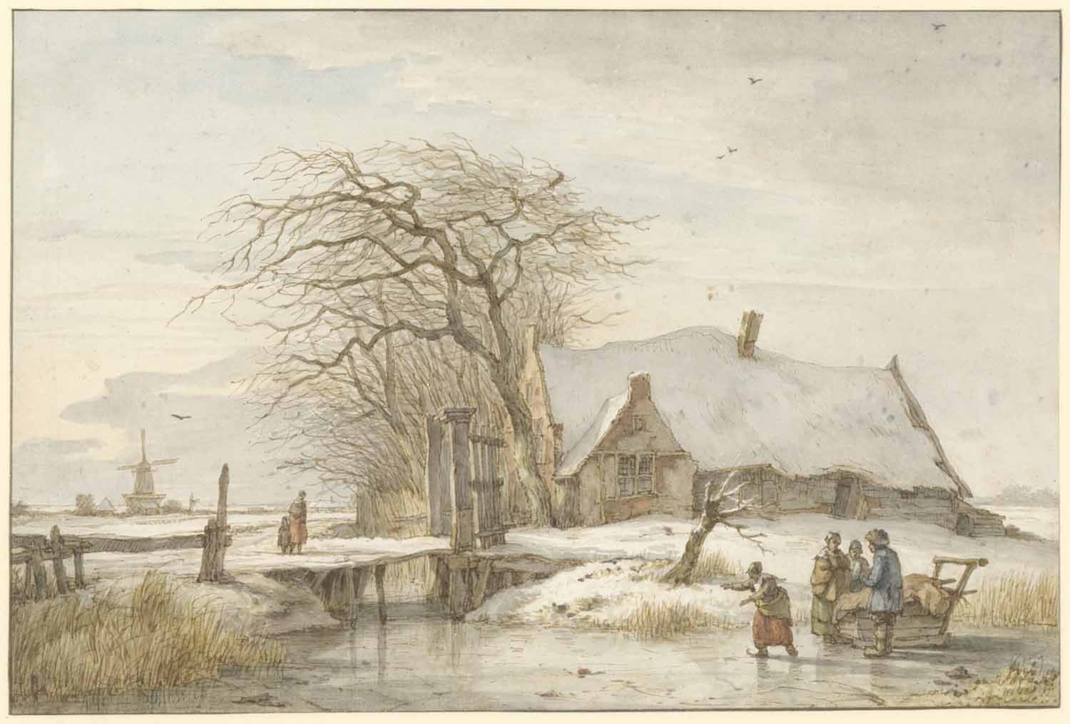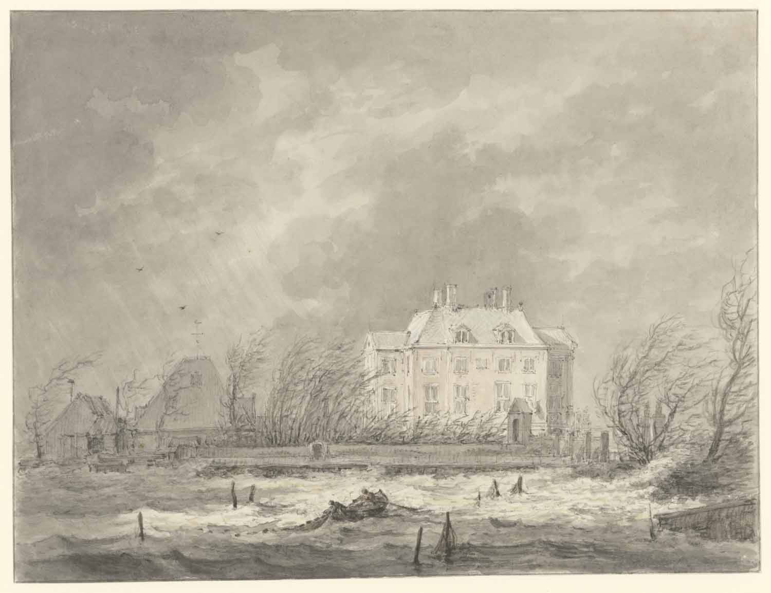 Een boerenwoning aan een sloot bij winter