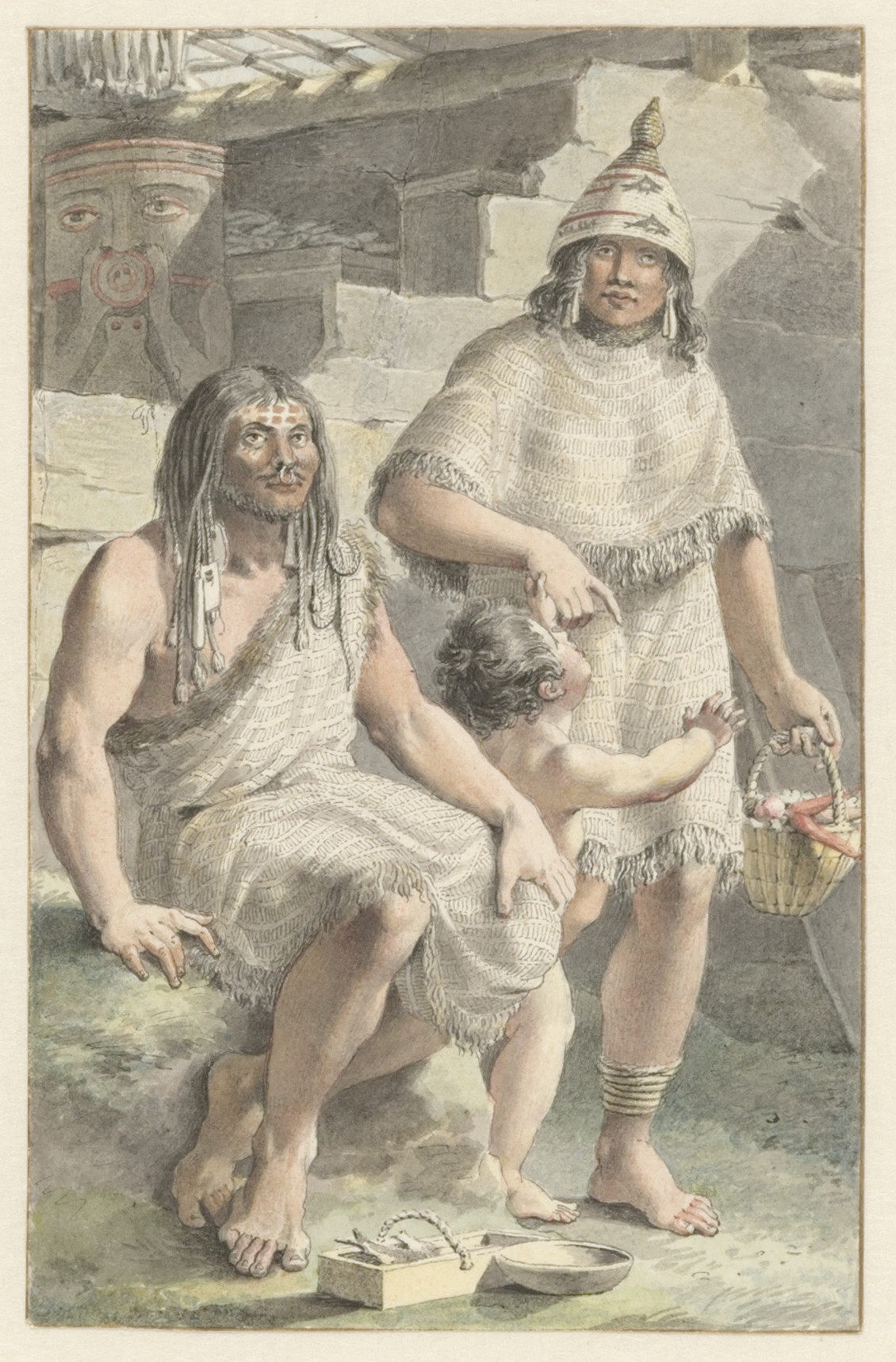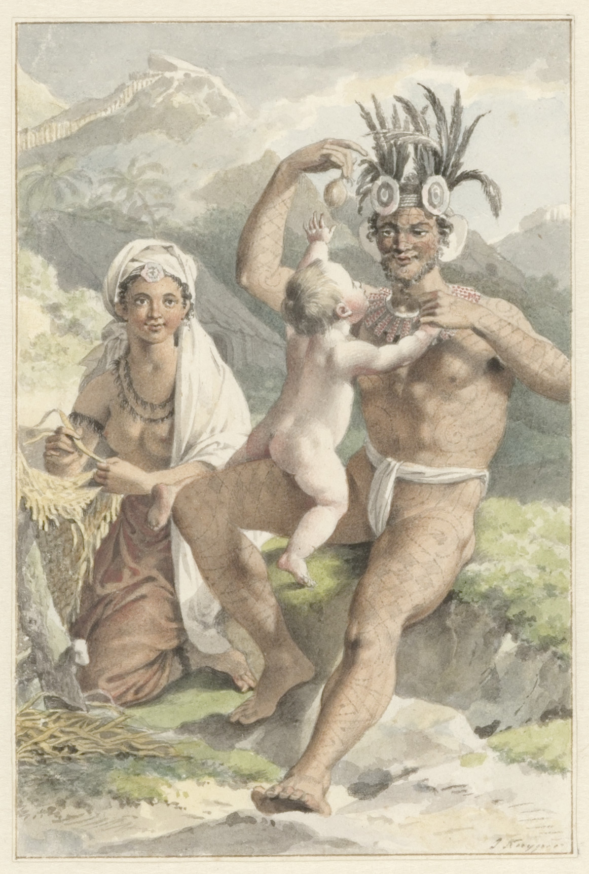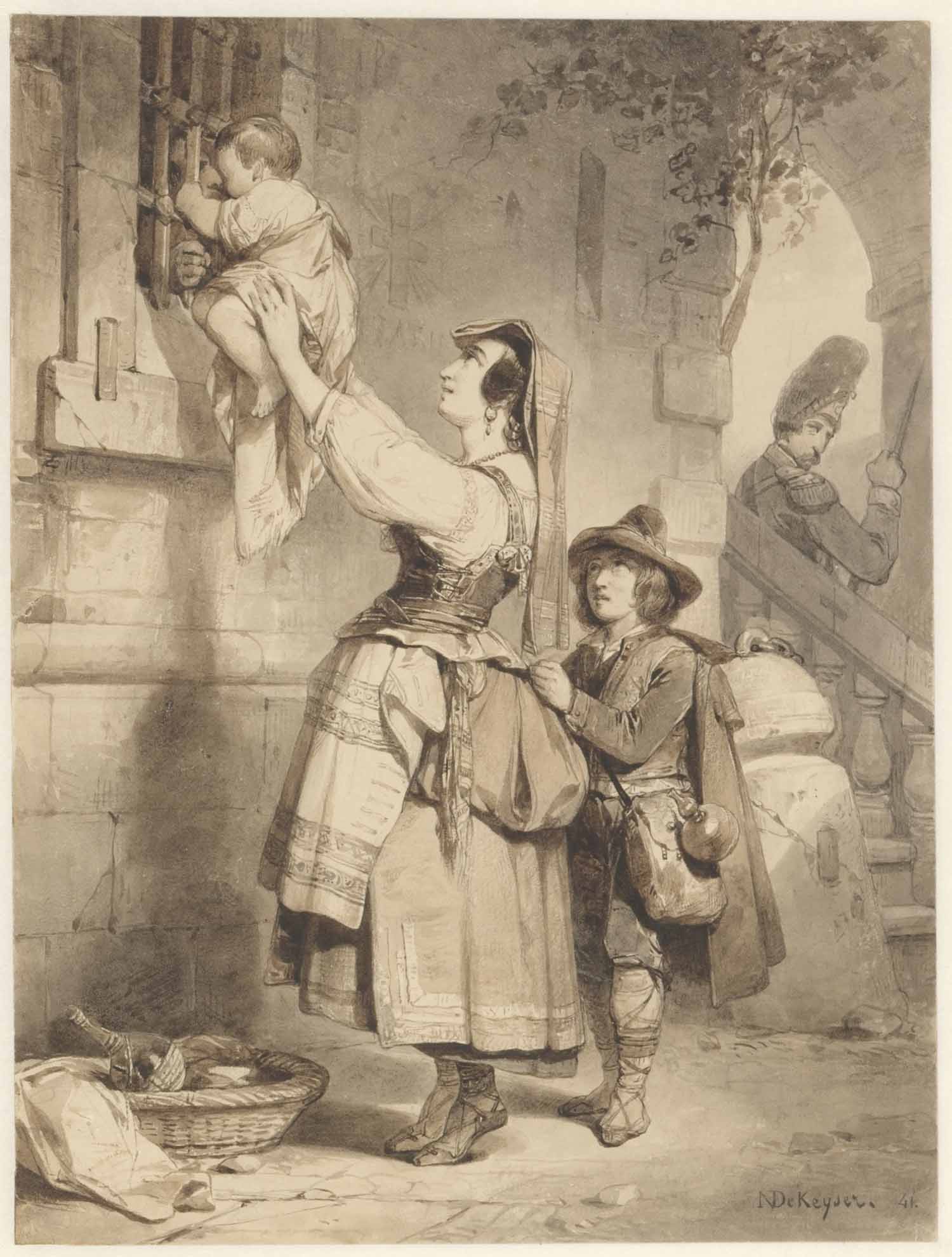 Eene Italiaansche vrouw houdt een kind voor het raam...