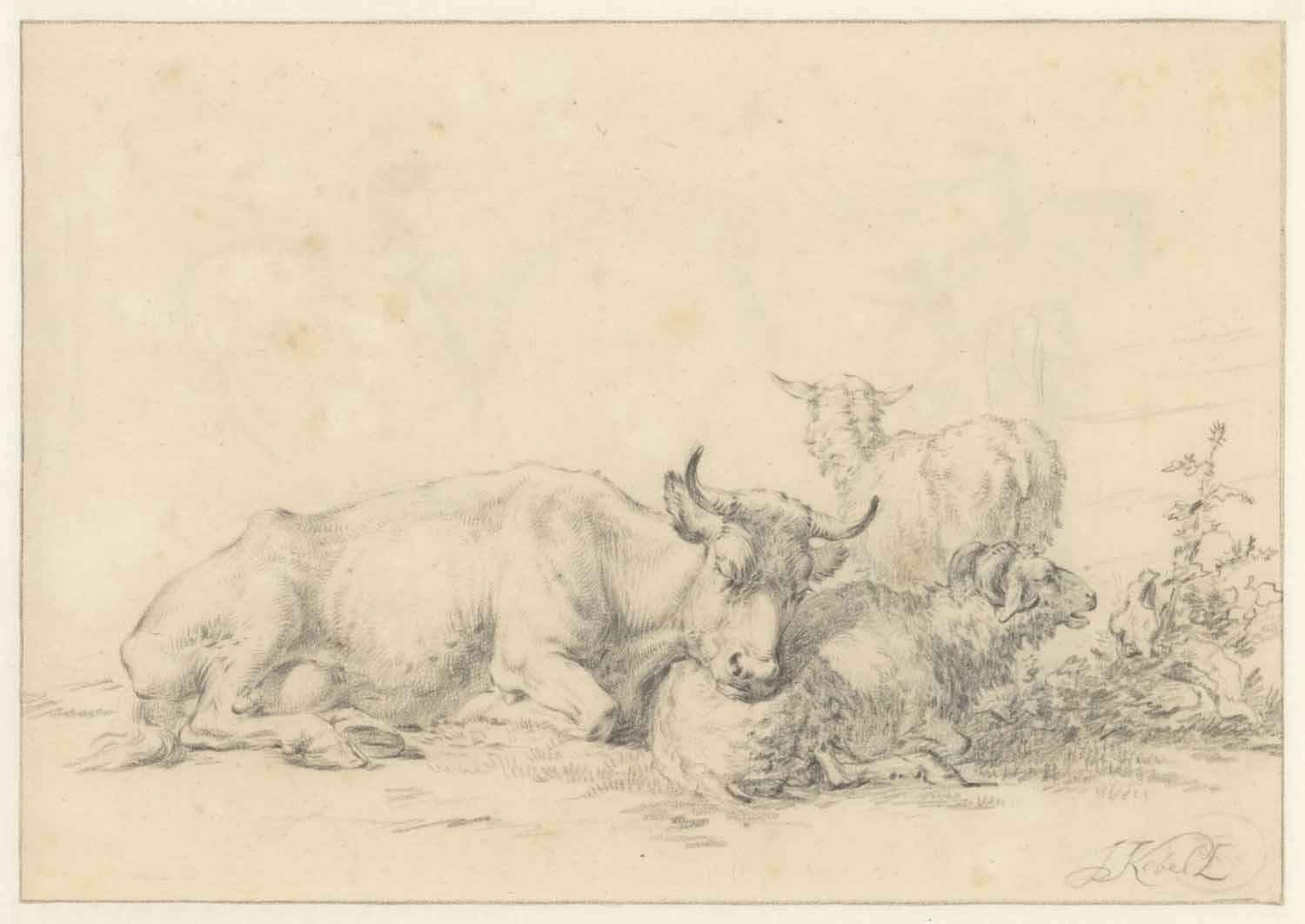 Eene liggende koe en twee schapen. Een liggend paard...