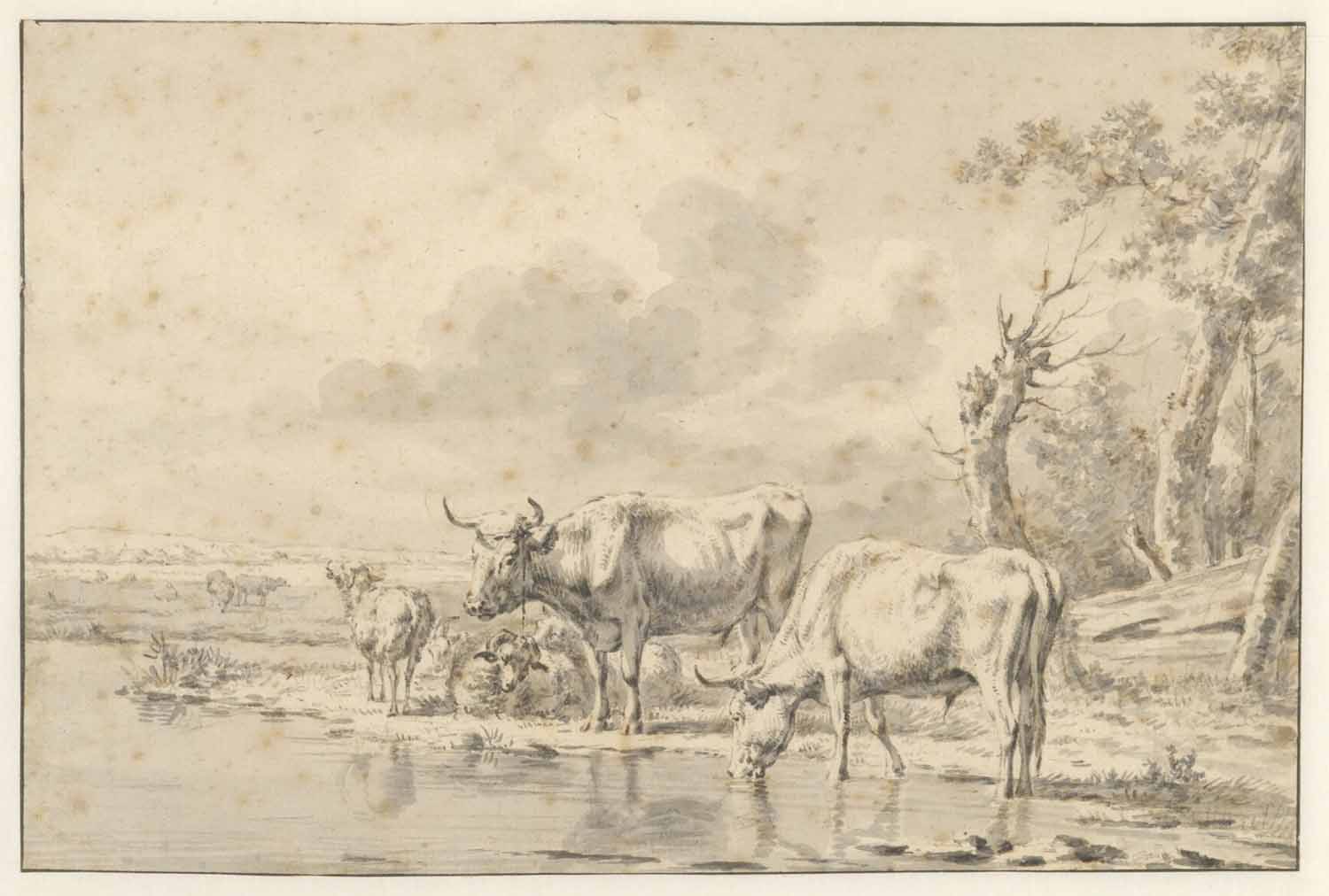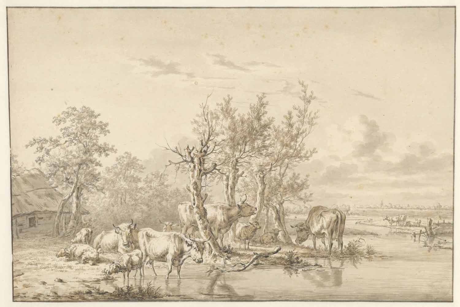 Eenige koeijen en schapen onder geboomte bij een water