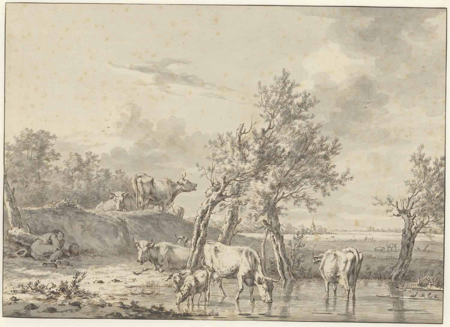 Een slapende herder bij eenig rundvee