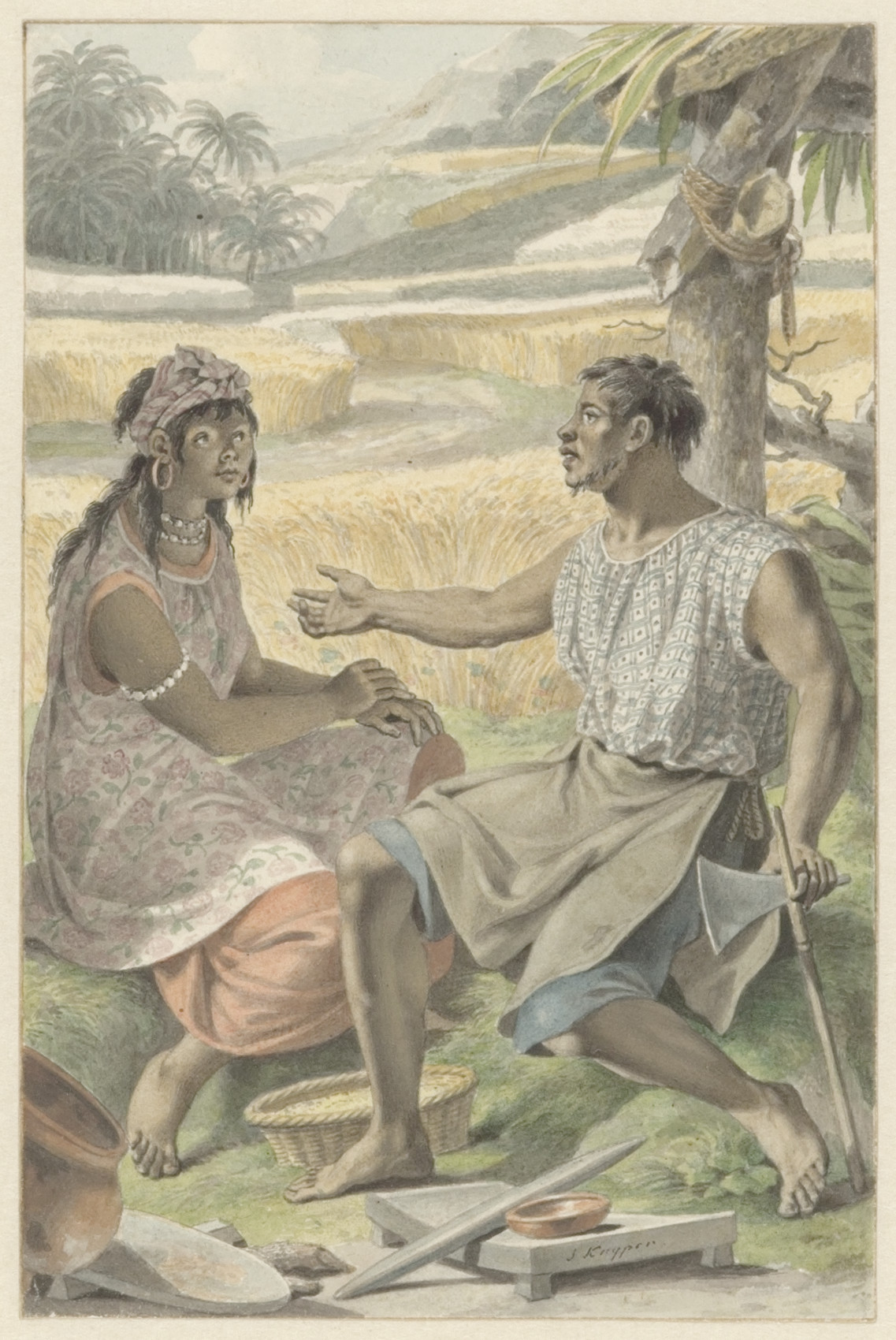 In een landschap rust een man op eene spade