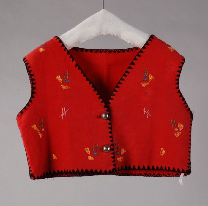 Mouwloos jongensvestje van rood flanel met in zwart ...