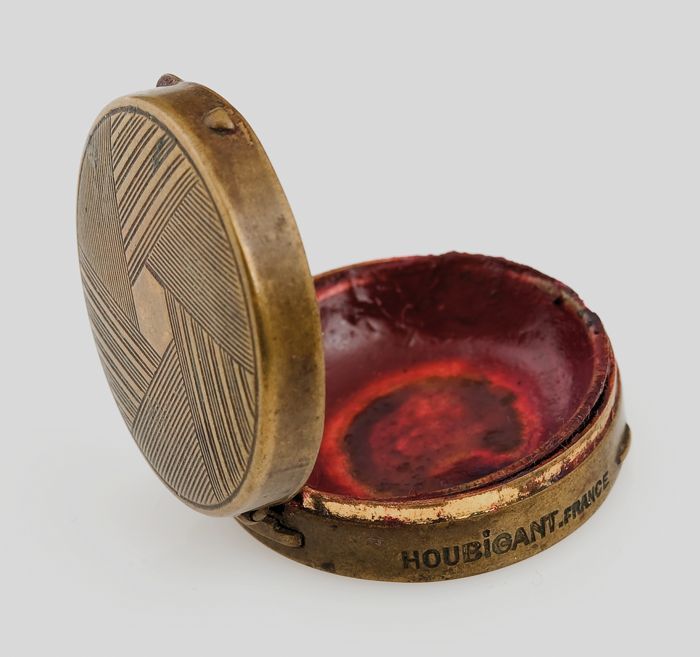 Klein rond koperen doosje met Art Deco reliëfdecorat...
