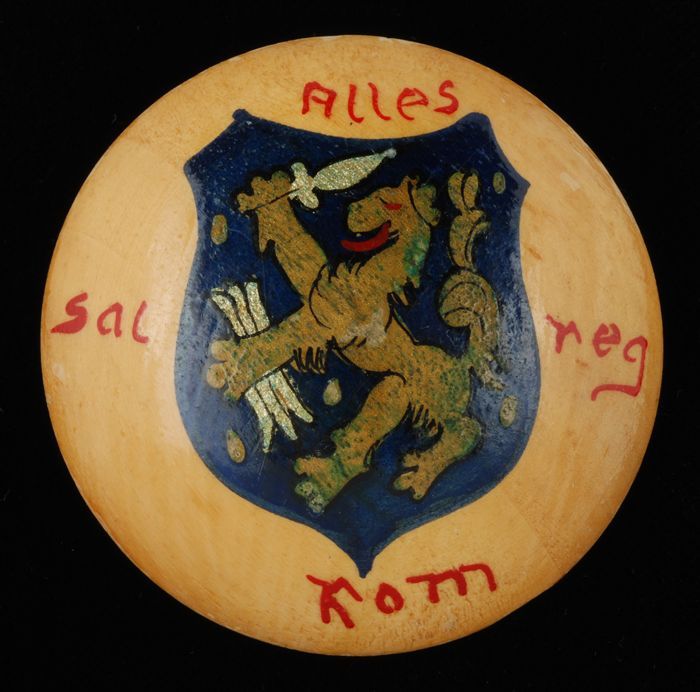 Ronde broche van hout, iets bollend en beschilderd m...
