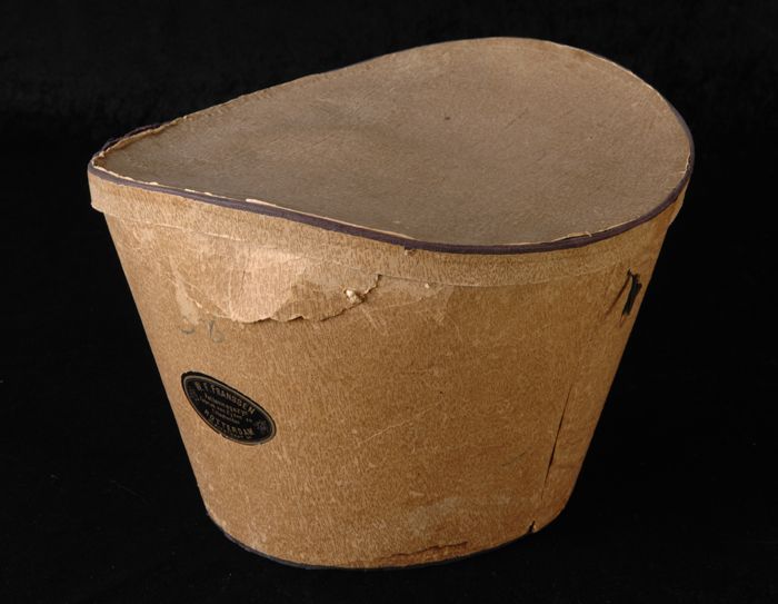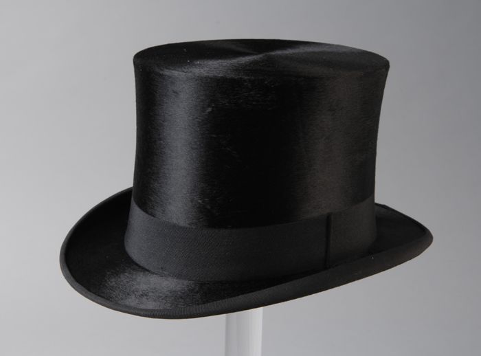 Zwarte, zijden hoge hoed van Fa. Franssen aan de Kip...