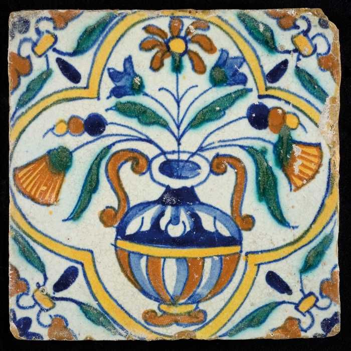 Bloemtegel, polychroom, hoekmotief vleugelblad