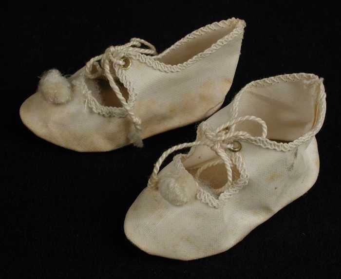 Paar miniatuur platte schoenen van wit linnen (?) me...