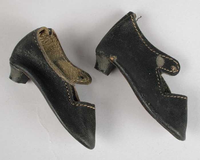 Paar miniatuur schoenen van zwart leer, wit sierstik...