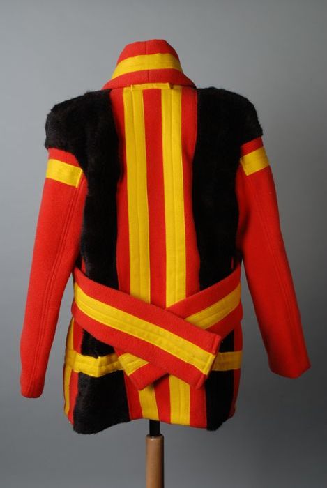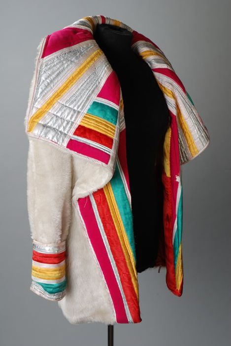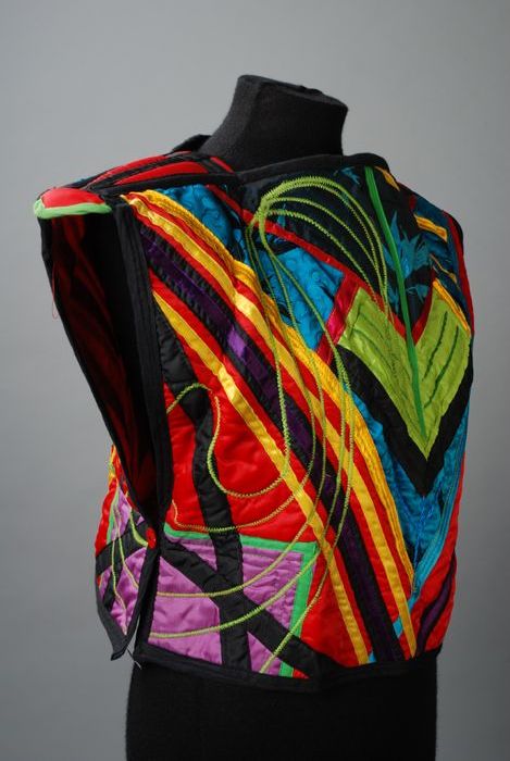 Taillelang hes van felgekleurde banen, in V-vorm opg...