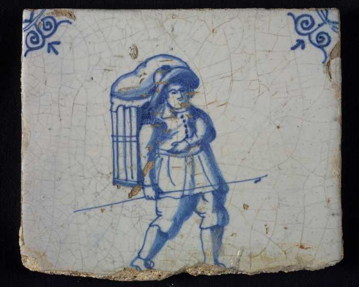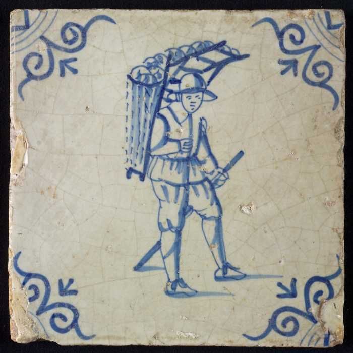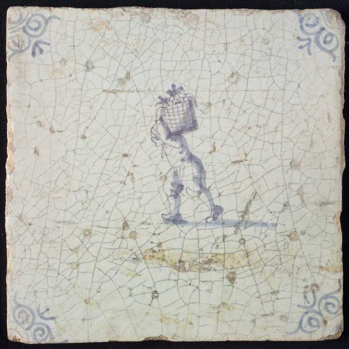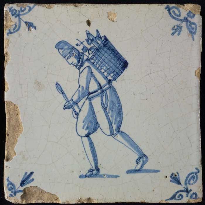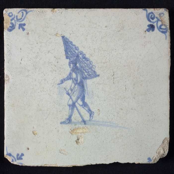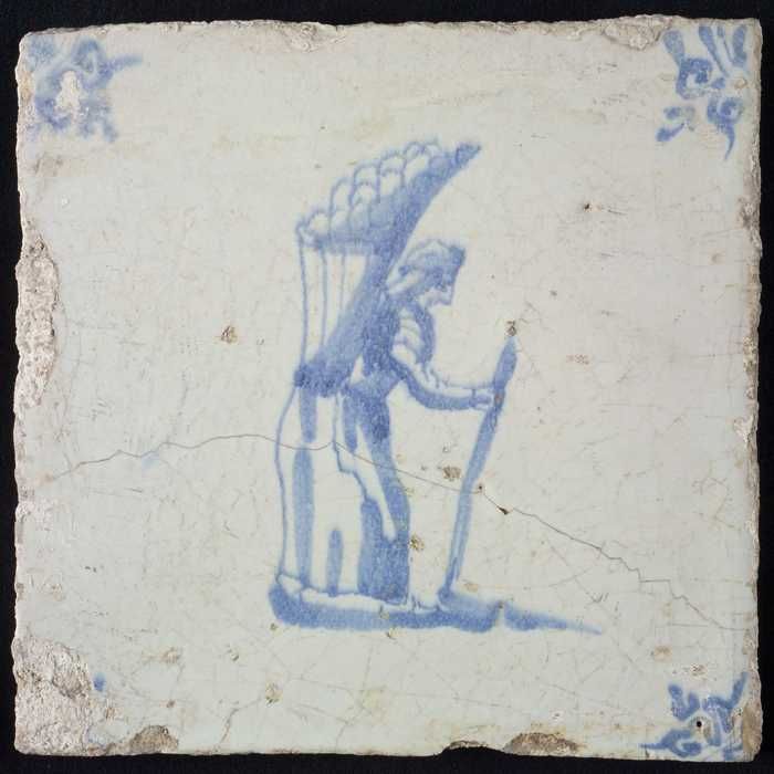 Figuurtegel, blauw, marskramer met mand, hoekmotief ...