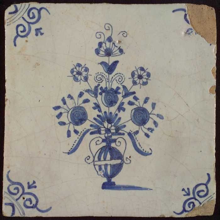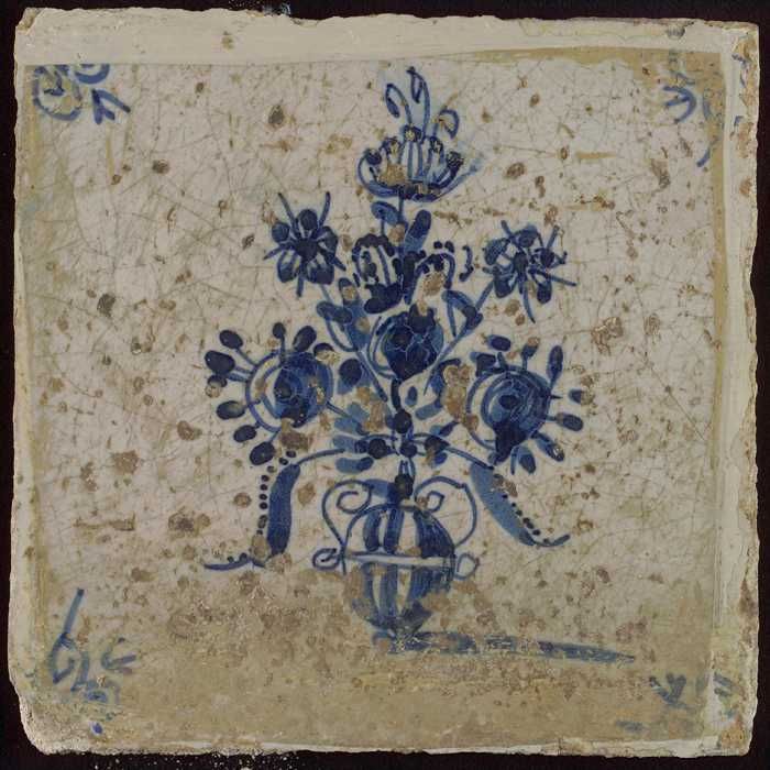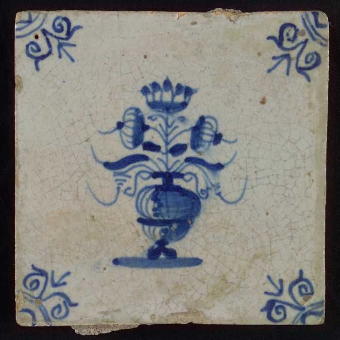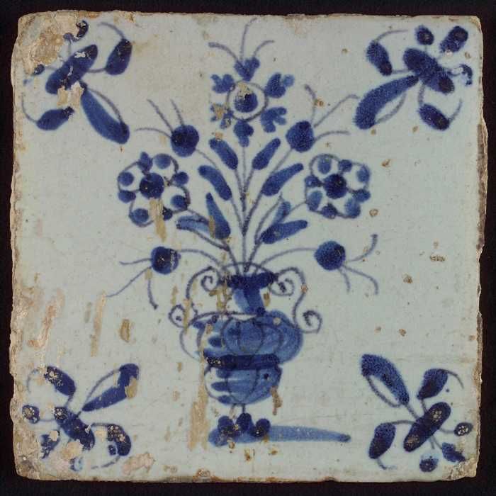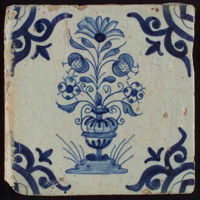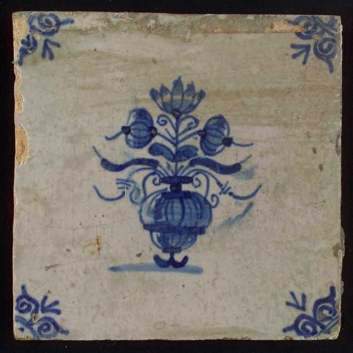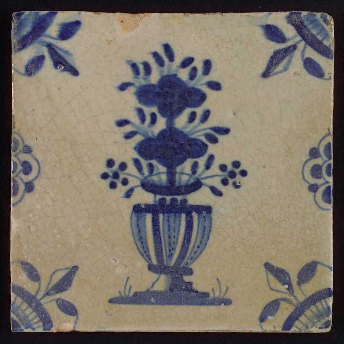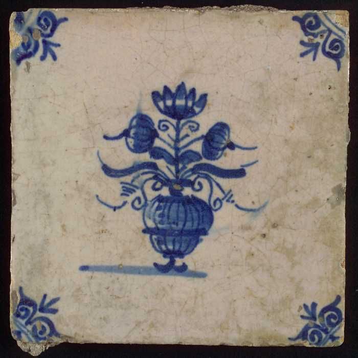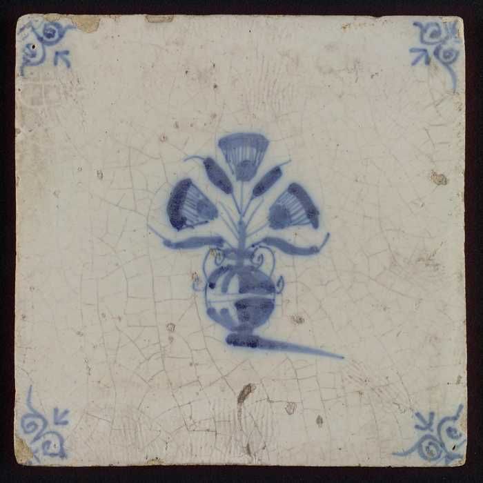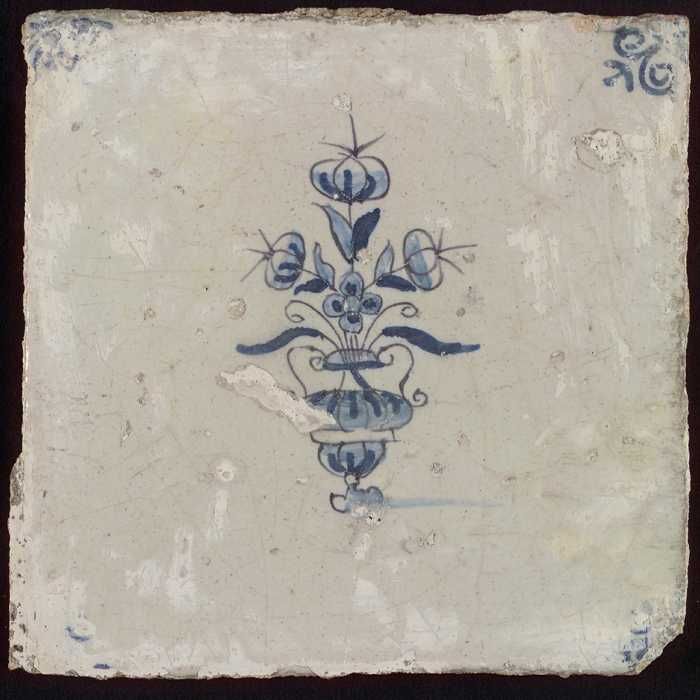 Tegel, bloempot in blauw op wit, hoekmotief gespaakt...