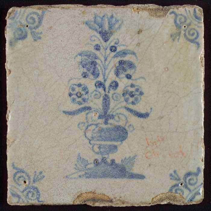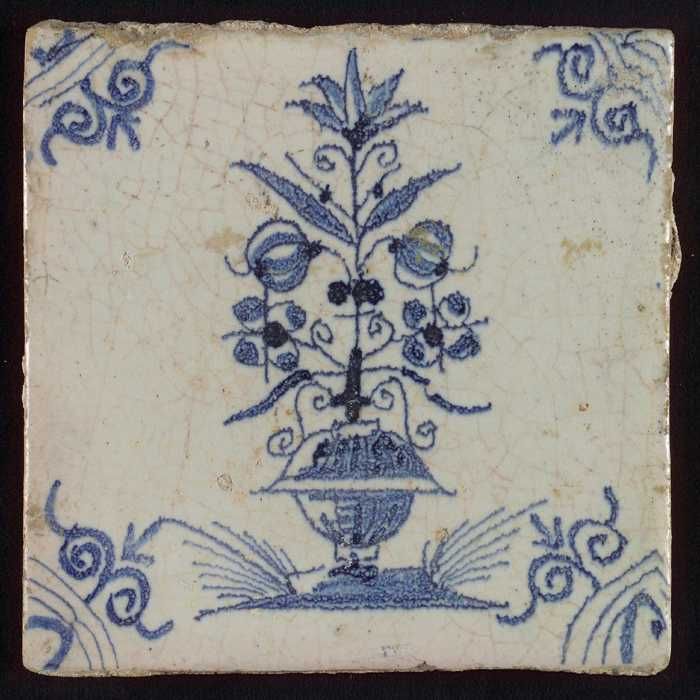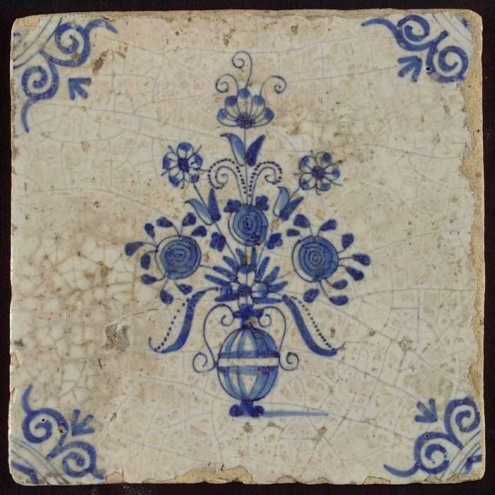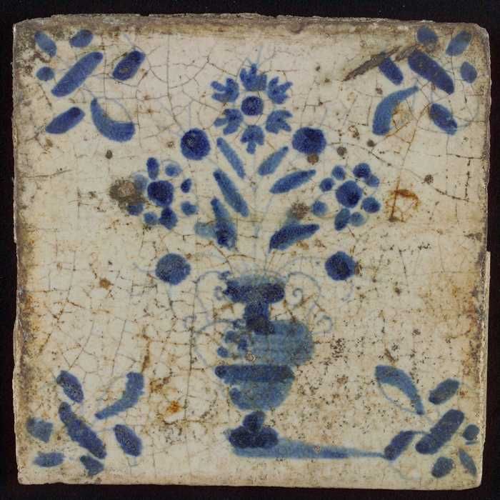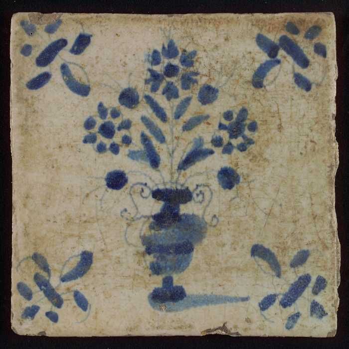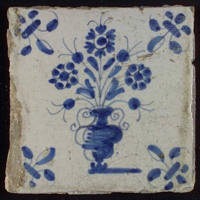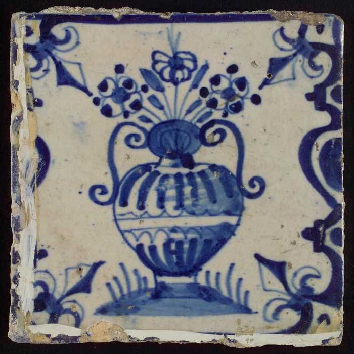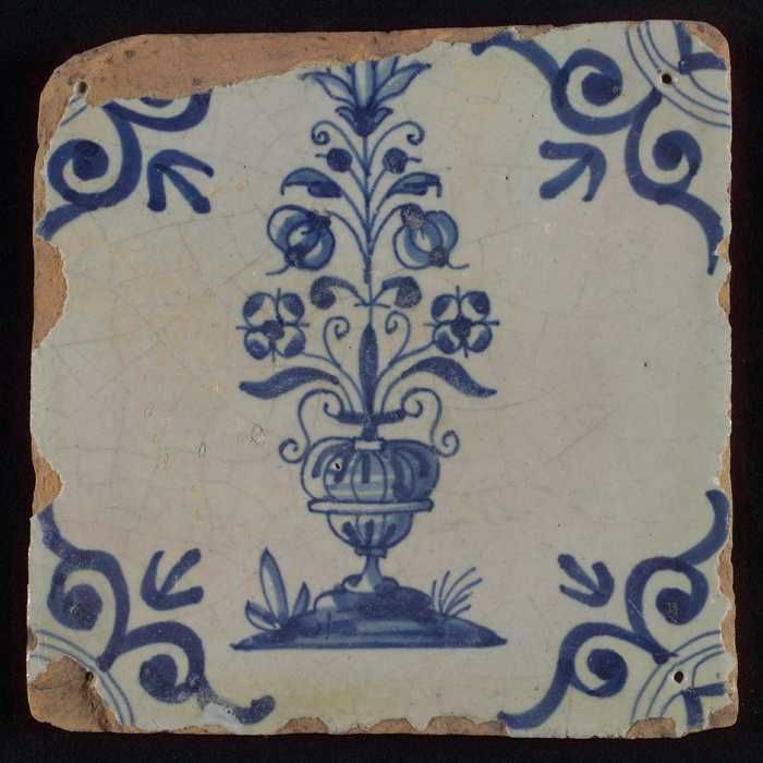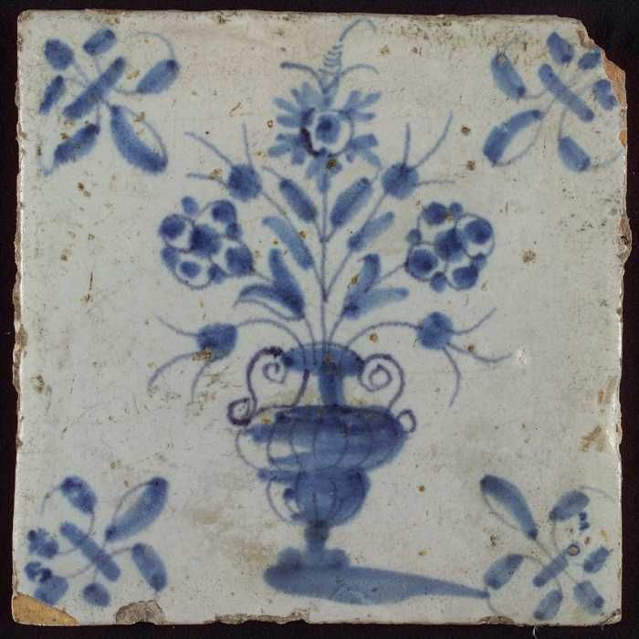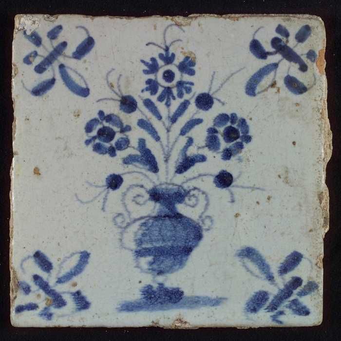 Tegel, bloempot in blauw op wit, hoekmotief gespaakt...