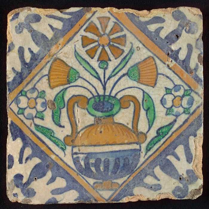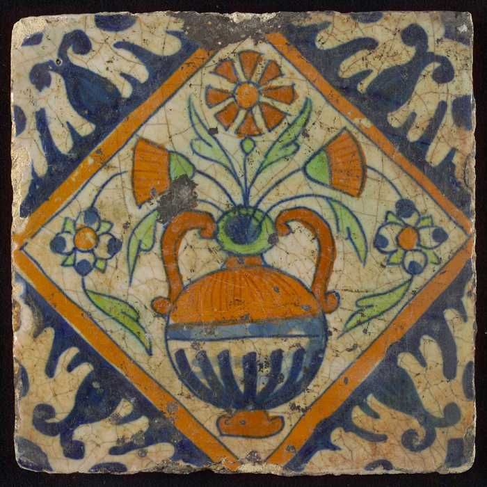 Bloementegel, bloempot in kwadraat, hoekmotief palmet