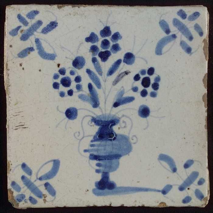 Tegel, bloempot in twee tinten blauw op wit, hoekmot...