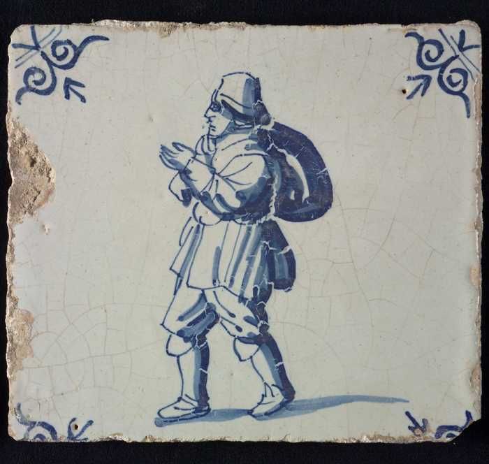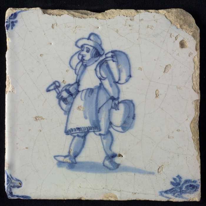 Figuurtegel, blauw, marskramer met stok, hoekmotief ...