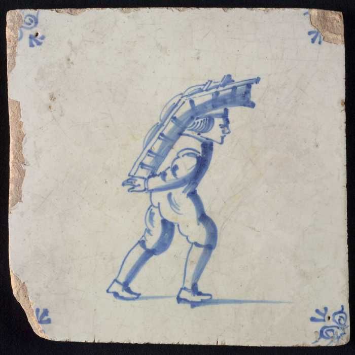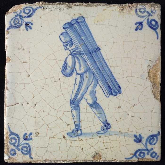 Figuurtegel, blauw, man met balken op de rug, hoekmo...