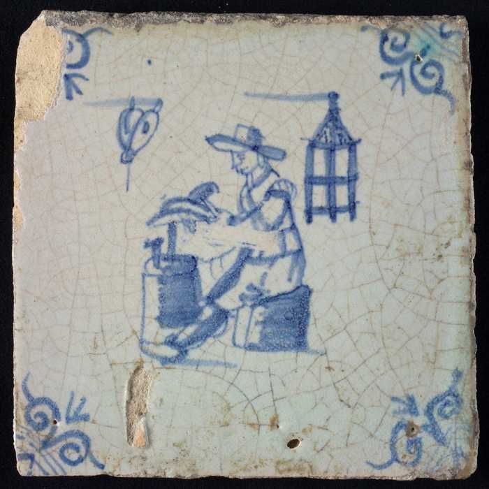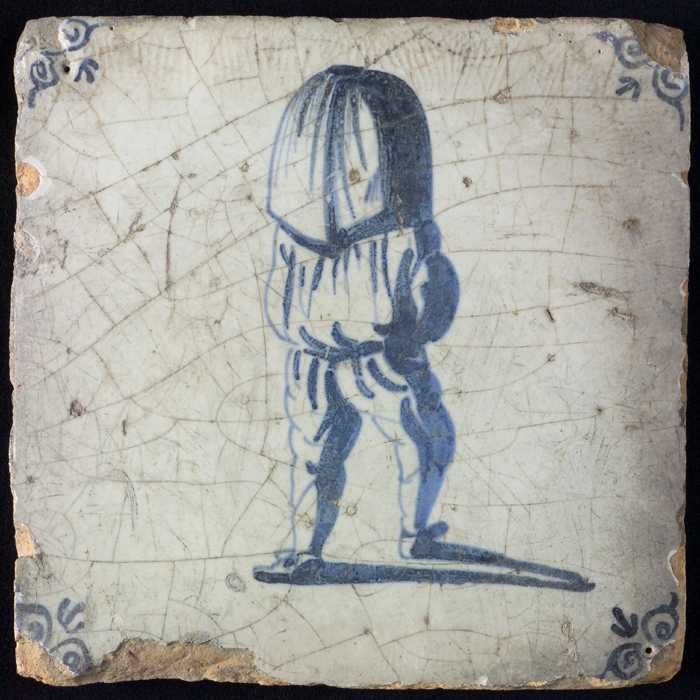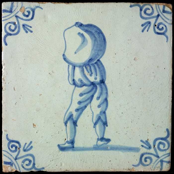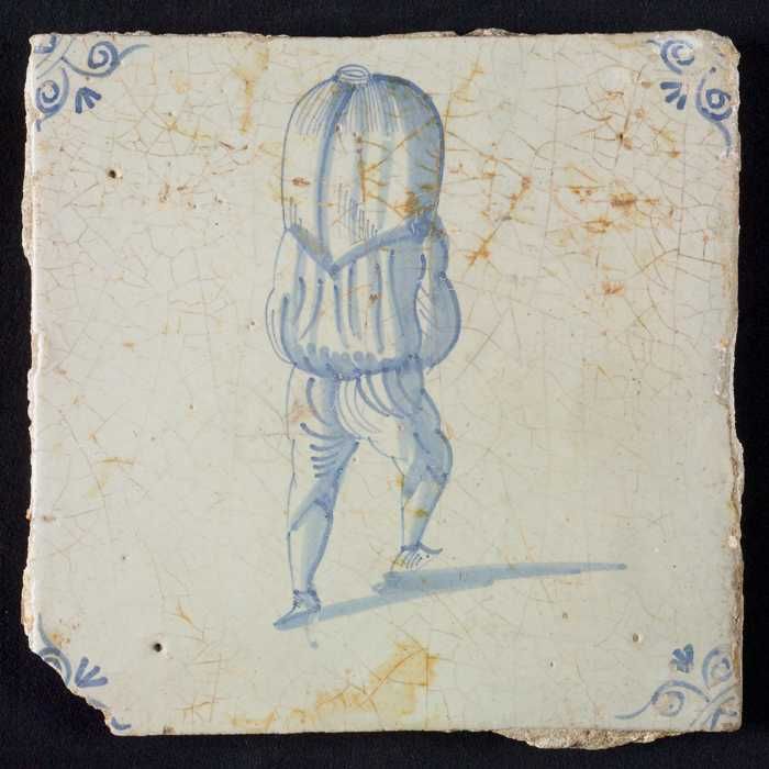 Figuurtegel, blauw, zakkendrager op de rug gezien, h...
