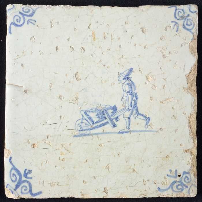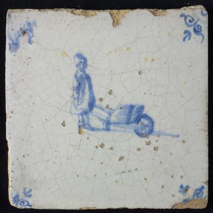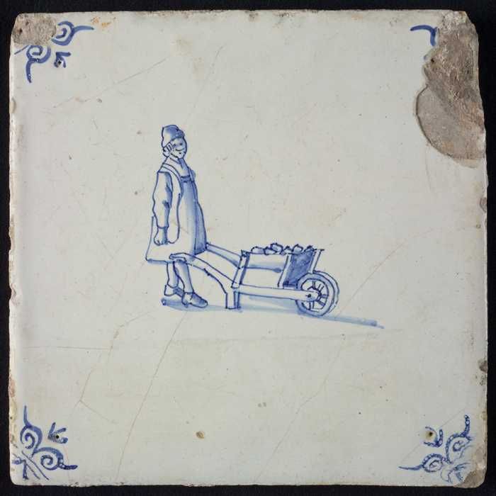 Figuurtegel, blauw, boerin met kruiwagen, hoekmotief...