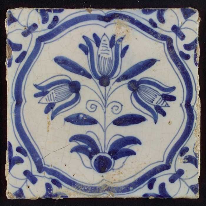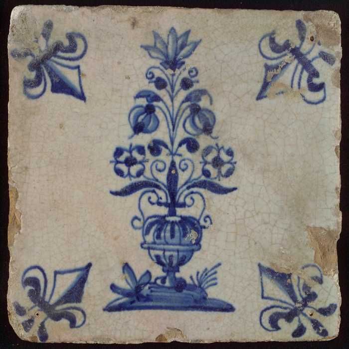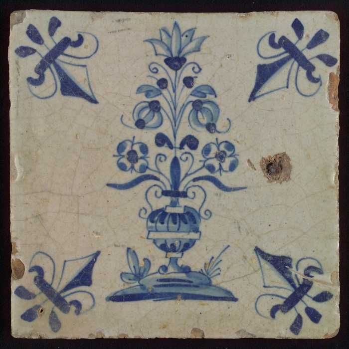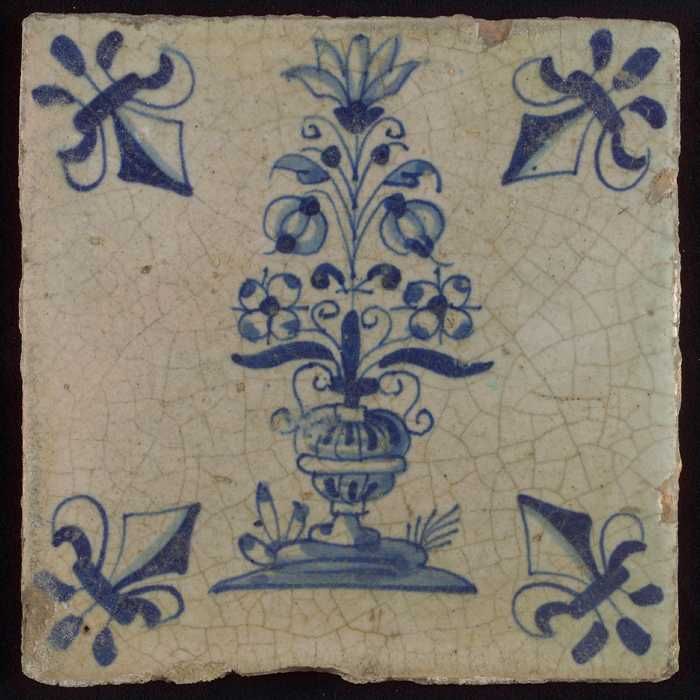 Tegel, bloempot in blauw op wit, hoekmotief lelie
