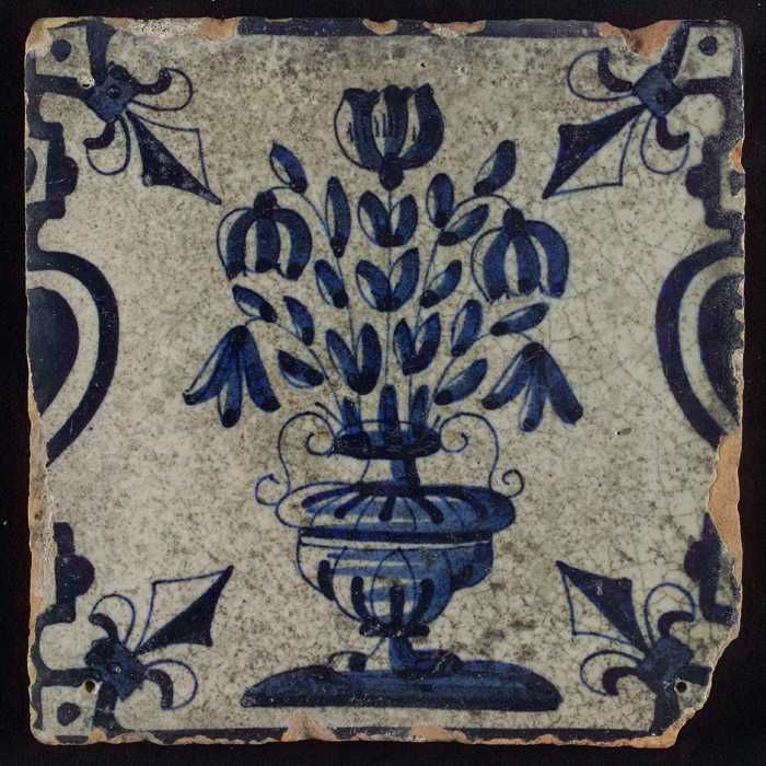 Tegel, bloempot in blauw op wit, hoekmotief franse l...