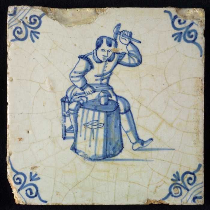 Figuurtegel, blauw, smid met hamer en aambeeld, hoek...