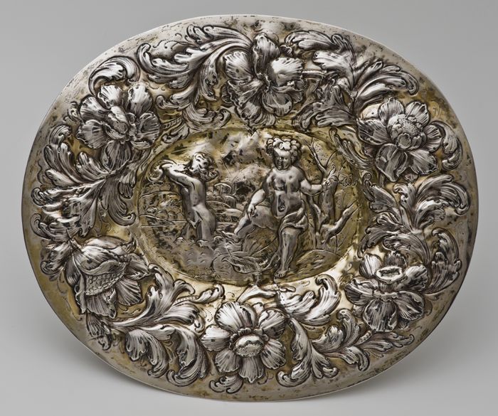 Ampullenschaal op vier poten met twee putto´s en blo...