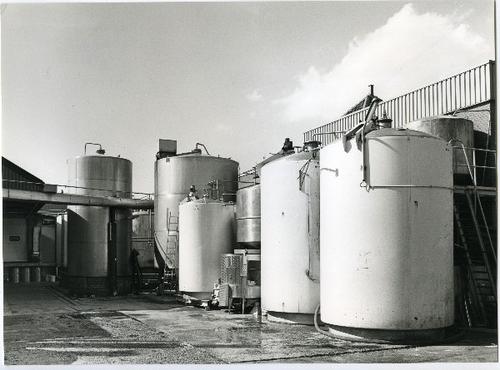 Foto in zwart-wit van opslagtanks bij de zuivelfabri...