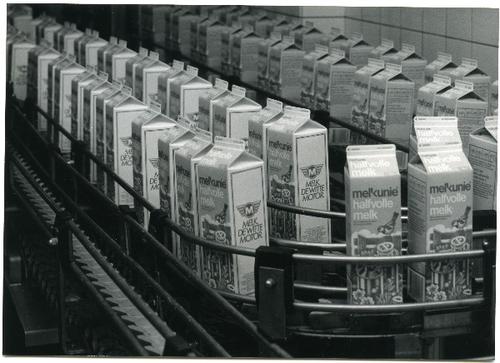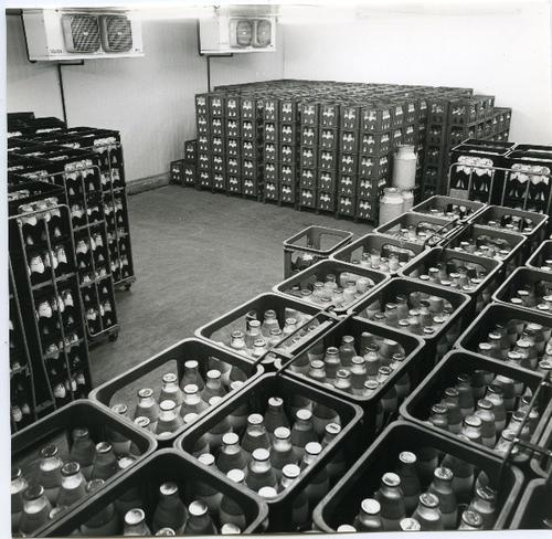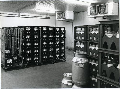 Foto in zwart-wit van de melkontvangst bij de zuivel...